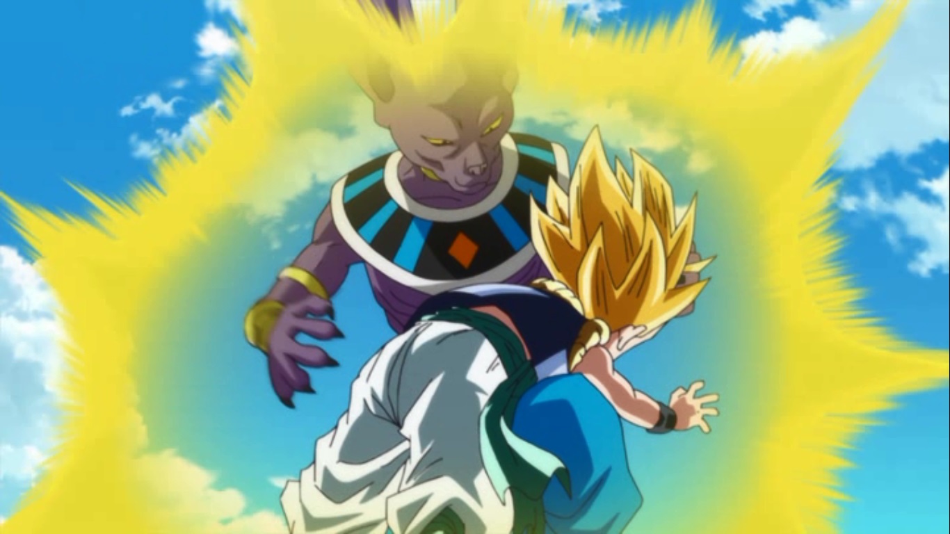 No seriously, what the hell are the android, Mr. Solar Flare, and the giant Yoshi gonna do about it? Spoiler alert: NOTHING!! The cat takes each of them out with a flick of his wrist and only manage to make matters even worse. Vegeta, being the responsible one yet again, convinces Beerus to at least take his rampage away from the party and does what he can to hold him off. He only lasts about fifteen seconds, but at least he tried! Who else is up on the chopping block? Well Gohan tried the full nelson technique he learned from his father, but even that doesn’t stand a chance against Beerus. Also, Gotenks shows up for half a second to get his scrawny ass spanked by the God of Destruction.