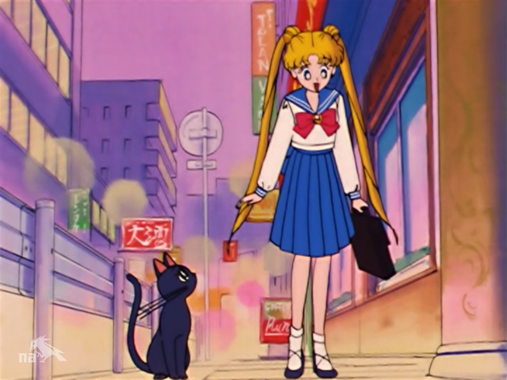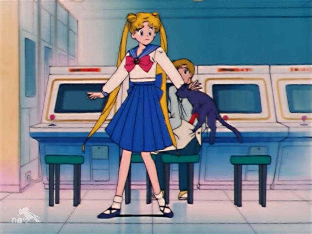 Usagi bypasses the shiny new cathedral for demonic activity and instead has her fortune read by the kind old man who tells her that someone out there likes her.  She assumes that it’s her friend who works at the arcade (Motoki) and heads straight there to greet her destiny!  As you’d expect, Motoki is super charming and sets Usagi’s heart all a flutter while being completely oblivious to her affections.  That MIGHT have something to do with her only being fourteen and he looks to be a college student.  Just as things are starting to heat up (at least for one person), Luna appears out of nowhere and provides the mother of all mood killers.