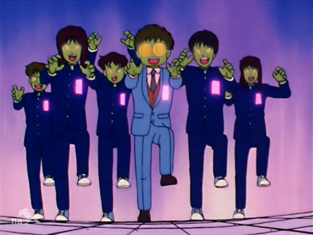 This odd dichotomy between her look and her voice (I guess she’s supposed to sound Romani) is most likely an outcome of the dub, where an English audience’s expectations on what a fortune teller sounds like clashes with the Japanese interpretation of what a fortune teller looks like.  I’m surprised though that they did it this way considering this ISN’T the super localized version from the nineties.  Maybe it’s an intentional gag to give her a comically mismatched voice (like Dracula the Dirty Old Man) but I doubt it considering her voice isn’t THAT extreme.  It’s just an odd accent choice.  So the evil psychic’s plan seems to be to take all the dudes that come by and turn them into asshole mind slaves.  Umino is one such victim and basically goes all Peter Park in Spider-Man 3 at school the next day.  I half expect James Brown to start playing as he walks around school out of uniform, laughs maniacally in class, and flips up his homeroom teacher’s skirt.  Wait, what!?