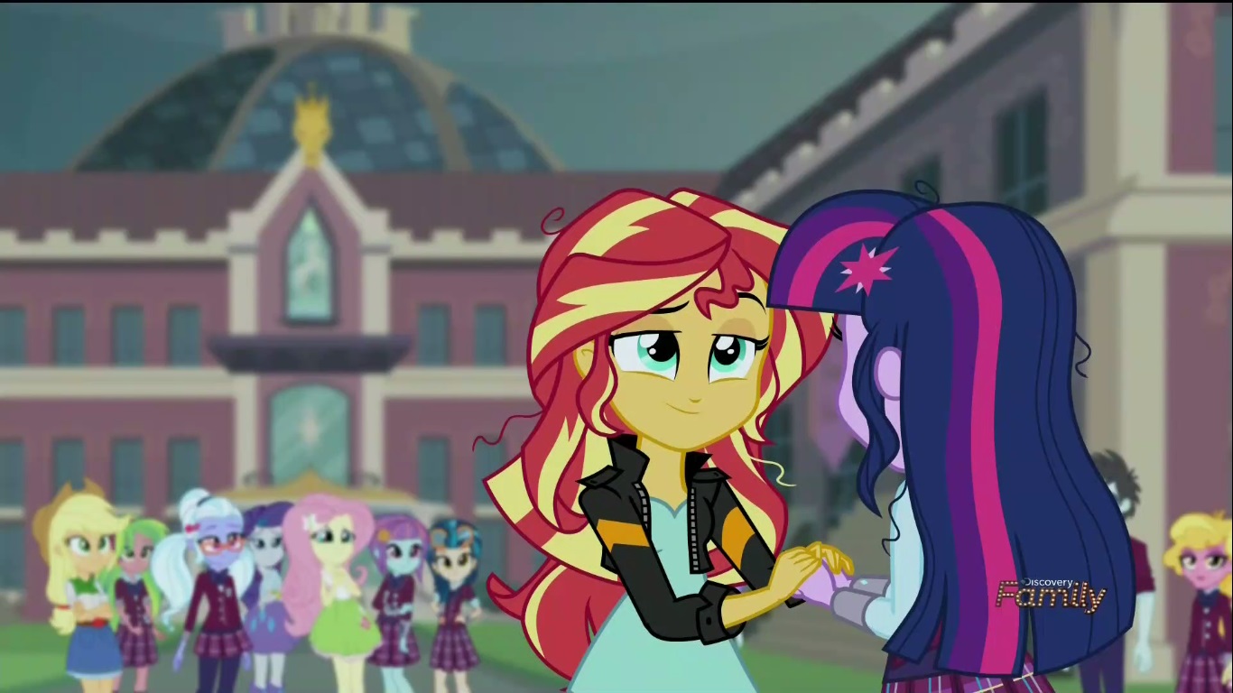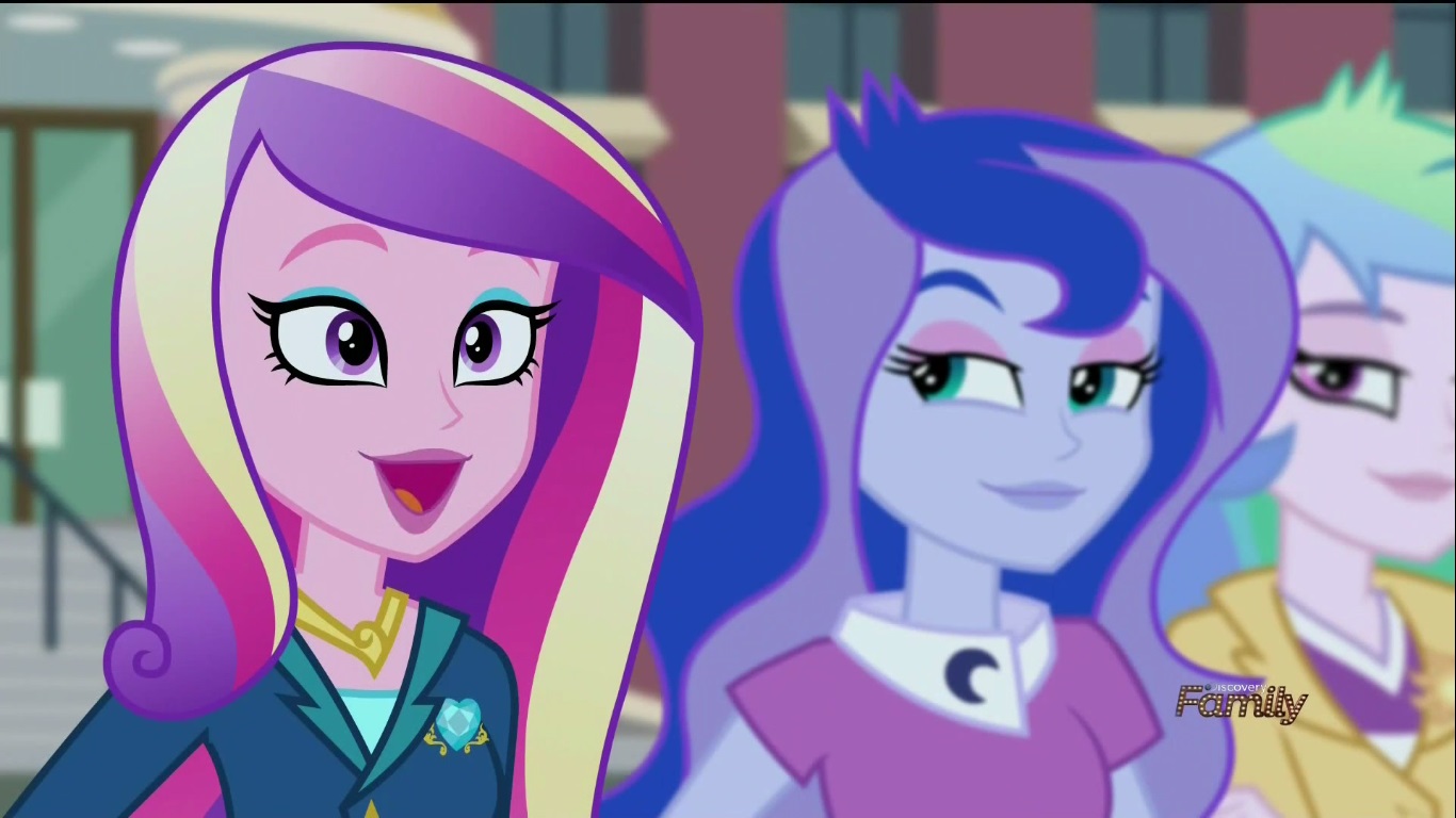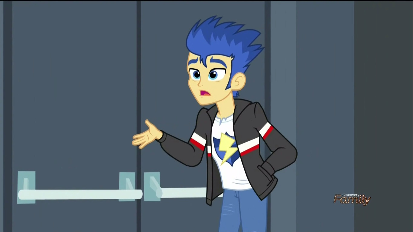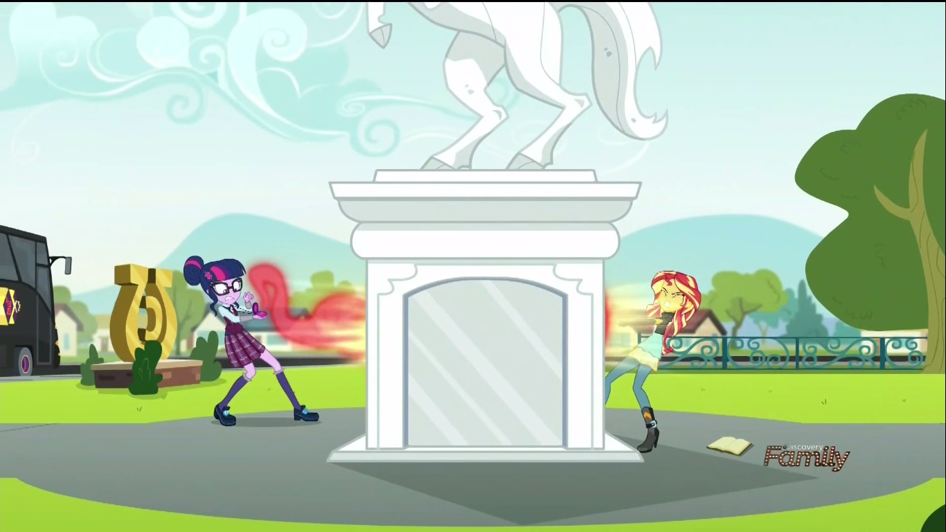 Once the students gets to Canterlot High, Twi-prep wanders off from the group to use her magic tracking device to find out where these strange readings are coming from, and instantly gets bombarded with Canterlot High students giving her well wishes because she looks just like Twi-pony. She even runs into Flash Sentry who, god bless him, is STILL holding a torch for the pony princess who only occasionally crosses dimensions to visit. What’s he hoping for in this long distance relationship anyway? Does he think their dating? Does TWI-PONY think they’re dating? I don’t know and neither does Flash who once again is befuddled by Twi-pony’s odd behavior (this time because it’s Twi-prep) and is left all alone to twist in the wind.