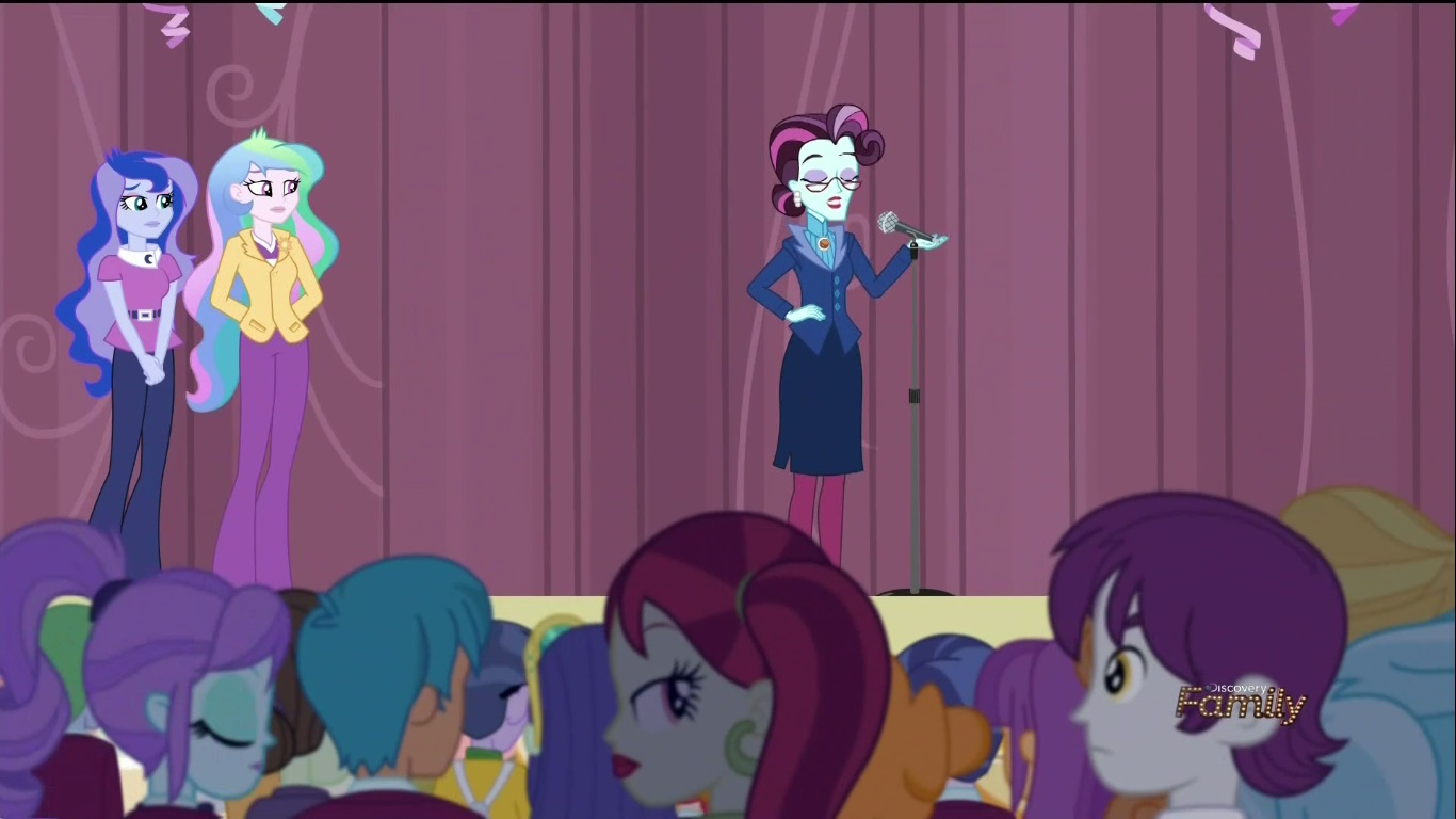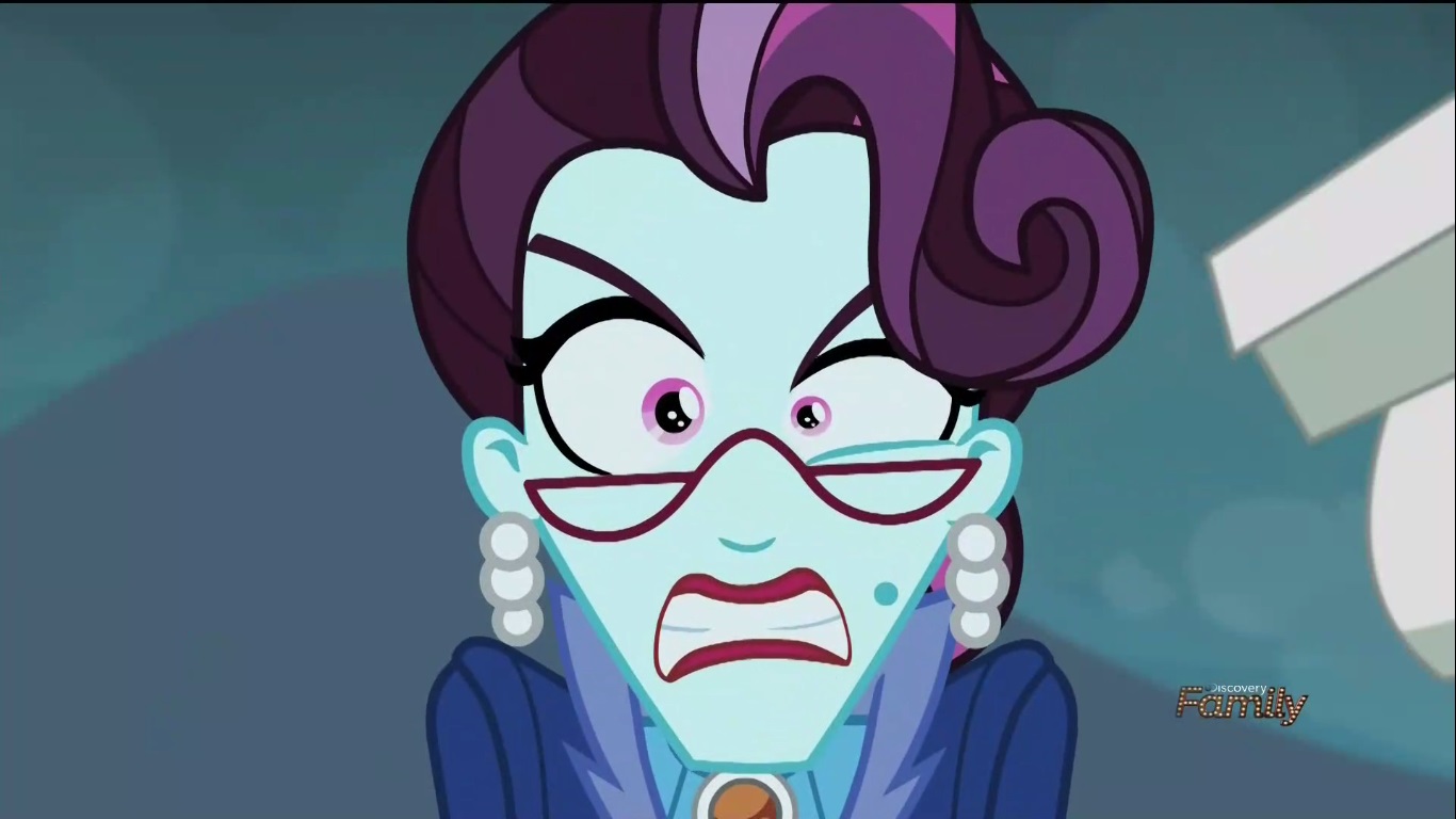 Seriously, how many times does Twi-prep’s amulet have to suck up mysterious substances before she thinks to put the damn thing away!? She SOMEHOW misses Pinkie Pie getting deflated, but she DOES notice a brand new side effect. The device can now open portals to another world (I’m guessing it got that ability by sucking up the portal), but the affect can be neutralized by closing the contraption. Oh well THAT’S good. The fate of the multiverse relies on a compact clasp working properly. Isn’t there a Friendship Games or something we should be getting to? Not yet, because Principal Cinch has to stop the party dead (kills the music and turns on the lights), get up on stage, and talk shit to Canterlot High IN THEIR OWN SCHOOL!! For someone who’s SO prim and proper, she has the WORST FUCKING MANNERS!!