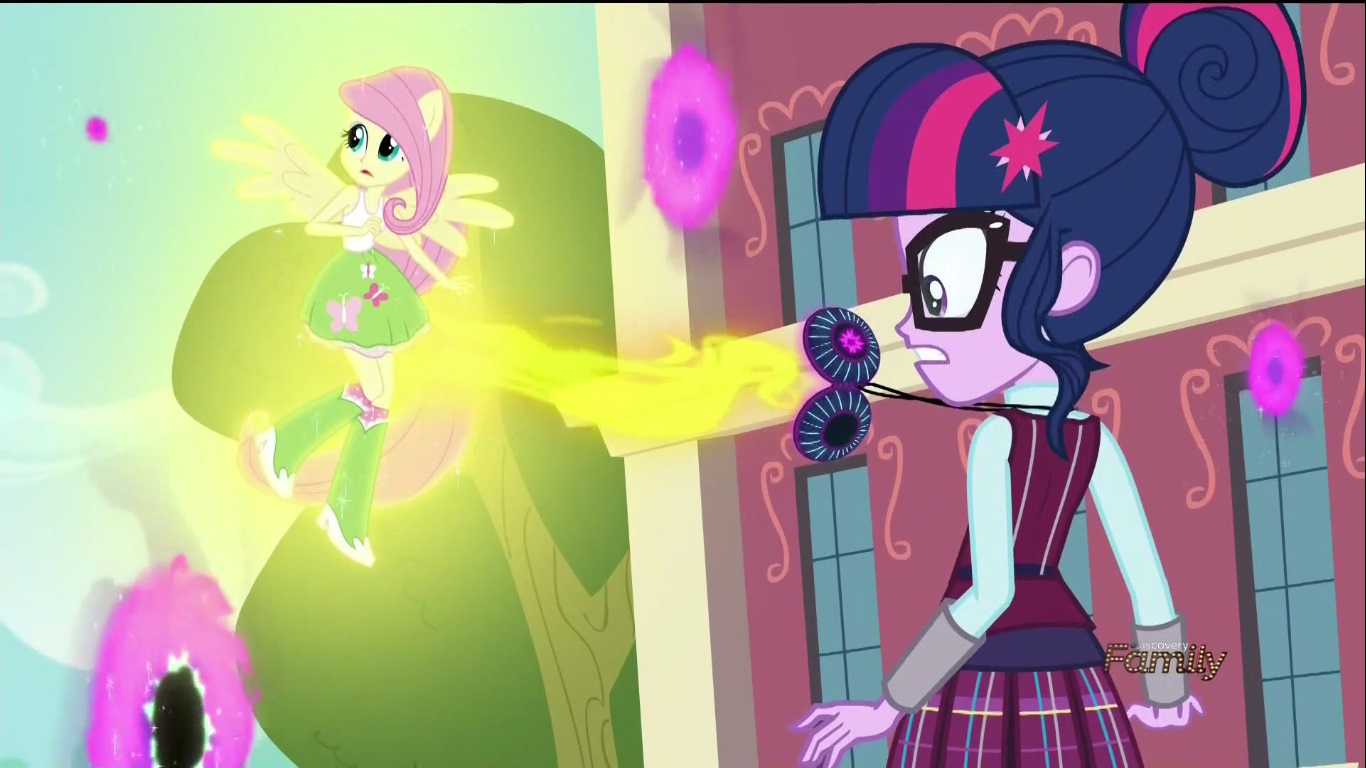 The event begins with the archery portion where Twi-prep and the sarcastic one (I still don’t know what heck her name is) playing for Crystal Prep and Fluttershy and Applejack playing for Canterlot High. Things go pretty well for three of them, but guess which one is having trouble?