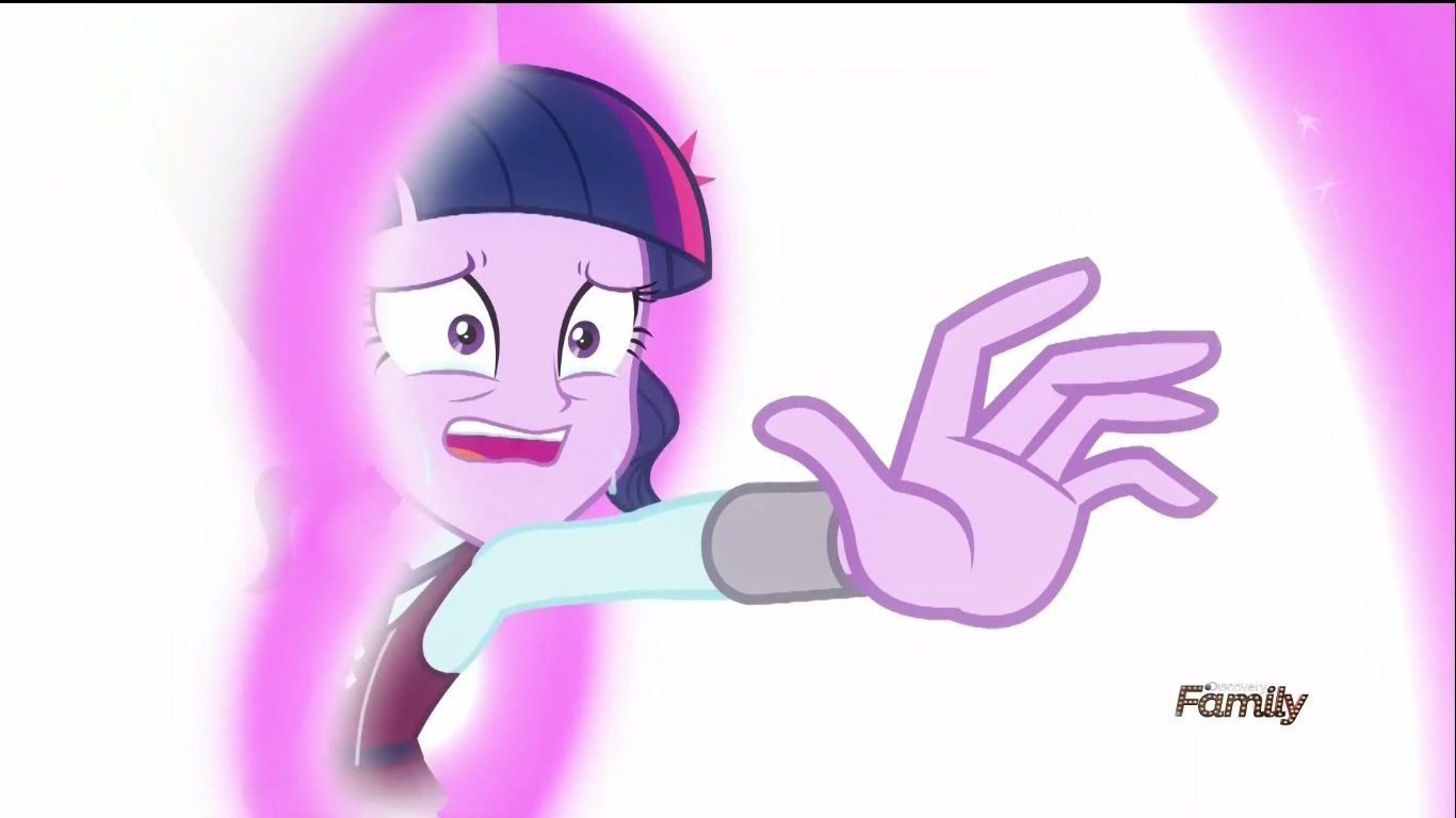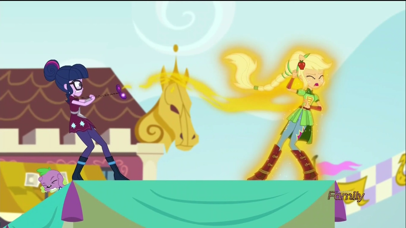 I’m not blaming her! She shouldn’t have been put in this position in the first place! Was this all worth it to Principal Cinch? Was it worth risking getting fired and getting arrested just to force her on the team!? Twi-prep continues to fail at her leg of the race and everyone is giving her shit about it. No wait, that’s not right. Everyone from CRYSTAL PREP is giving her shit. Can someone tell me how they won this in the past when team work seems to be a big component of it, yet everyone here is a raging ass hat? Hell, maybe they just had SUPER competent people before which would mean that the Principal’s BRILLIANT plan to commit serious maleficence to force Twi-prep into the tournament is what will ultimately lead to her downfall? Good job choosing the ONE PERSON at your school to torment into joining this competition that will definitely be the weak link! Canterlot High is scoring an early lead because of this, but Applejack is sick of the crap that Twi-prep’s getting from her supposed teammates and goes over to help her. With her honest (wink wink) advice, Applejack is able to get Twi-prep to shoot a bullseye which is what she needs to finish her leg of the race. This leads to Applejack getting all ponified and she realizes the error of her ways as Twi-prep (still not aware of what the hell is going on with her own invention) sucks up her magic as well.