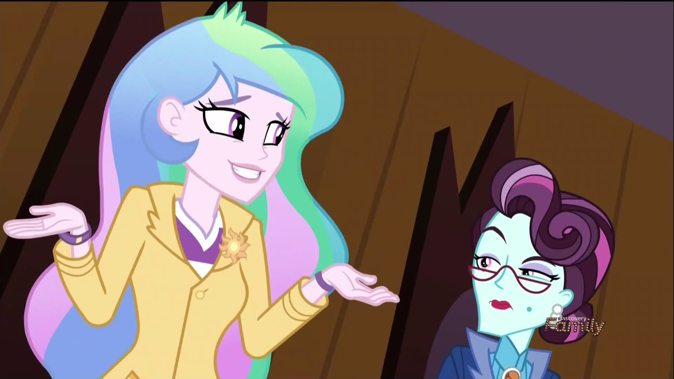 So Twi-prep is now on the team without telling anyone what had just happened (how does she not know the Principal will only escalate her demands because she has no leverage?) and will have to cut back on her investigation since she’ll be competing when she’s at Canterlot High. Her team by the way is filled with nothing but douche bags. What, did the Dazzlings get new crystals or something and just spread discord (heh heh) throughout this school? I don’t even know why they don’t like her that much. She’s clearly the smartest student there so she’ll supposedly be a great addition to the team according to whatever logic Principal Cinch is working from! Is it the point that they suck at teamwork and will learn the error of their ways at this tournament? If so, then how the hell did they win in the past if they don’t know how to work together!?
