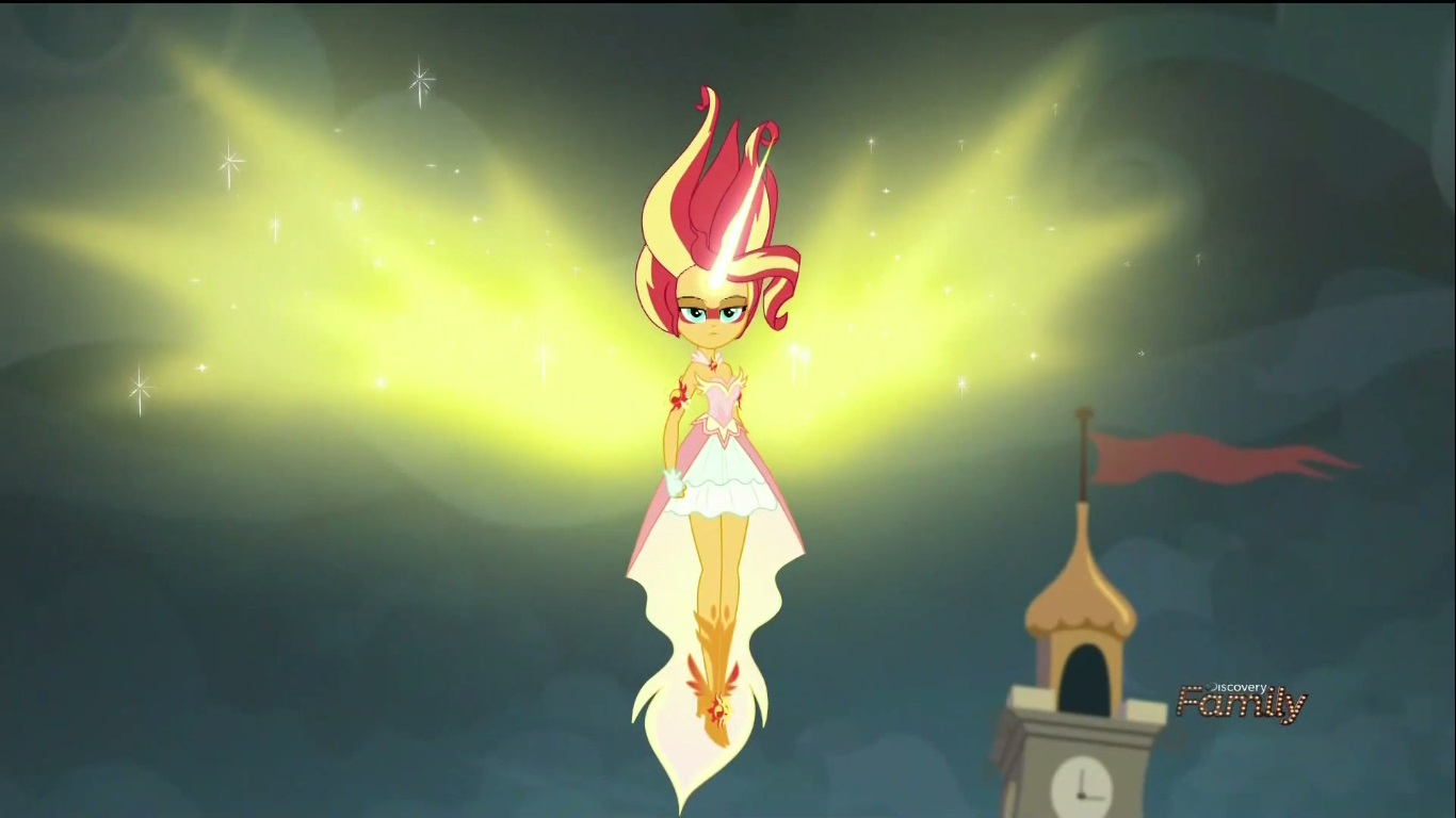 Twi-prep’s new found magical power goes straight to her head and she starts opening portals all over the freaking place to the point that I guess it starts to tear away at the fabric of reality. Since Dr. Who isn’t nearby to fix this (neither is Dr. Whooves) it’s up to the powerless Mane 6 to take care of it! No wait, most of them are trying to climb out of a tear in the space time continuum. Okay… plan B! Since Sunset Shimmer is the only one currently not about to fall to their death, her plan is to fight fire with fire by taking Twi-prep’s necklace (which has since been discarded) and does… something with it. She points the necklace at each of the Mane 6 who are slowly getting out of their predicament (with the help of their Crystal Prep sorta-counterparts because apparently THAT was a subplot that needed resolving) and then they start to glow with magic. I can’t tell if the Mane 6 are getting their magic back for some reason or if the necklace is giving it back to them. The necklace isn’t opening up or reacting in a way that indicates magic is being given or taken, so I guess they’re getting their powers back organically? But then if the device is sensing magic again, why isn’t it absorbing it? I don’t know but Sunset Shimmer seems to, and starts to give Twi-prep a speech about absolute power corrupting absolutely or something. They’re trying to make this a parallel to Sunset’s own fall from grace in the first movie, but I don’t really buy it here because Twi-prep’s arc isn’t even close to Sunset’s. I guess she COULD be going down the road to evil what with her being constantly used and put upon by those around her, but the snap to super villainy doesn’t feel all that convincing considering she’s never shown even a small tendency towards being mean to others or even selfish beyond a very reasonable extent. The only other thing I can think of is that the power ITSELF is corrupting, but then it’s also made up of the elements of harmony, so why is it making her evil? Again, if they had spent a little more time with her character (maybe she acts out in private once to vent her frustration) then this villainous turn wouldn’t feel so out of the blue, but they didn’t so we have to make sense of what they’re giving us. Well whatever is causing this new super badass Twi-prep to be all “FEEL MY VENGENANCE” about everything; it unfortunately has to come to an end. Personally, I’d like to see her cause some SERIOUS damage, especially to that Principal who scampered off like a total Jabroni. Oh well. Sunset Shimmer throws the necklace thingy down like a fucking smoke bomb which causes it to erupt in even MORE magic (didn’t all of it get sucked up by Twi-prep?) and turns her into Paragon Shimmer. Wait, seriously!?
