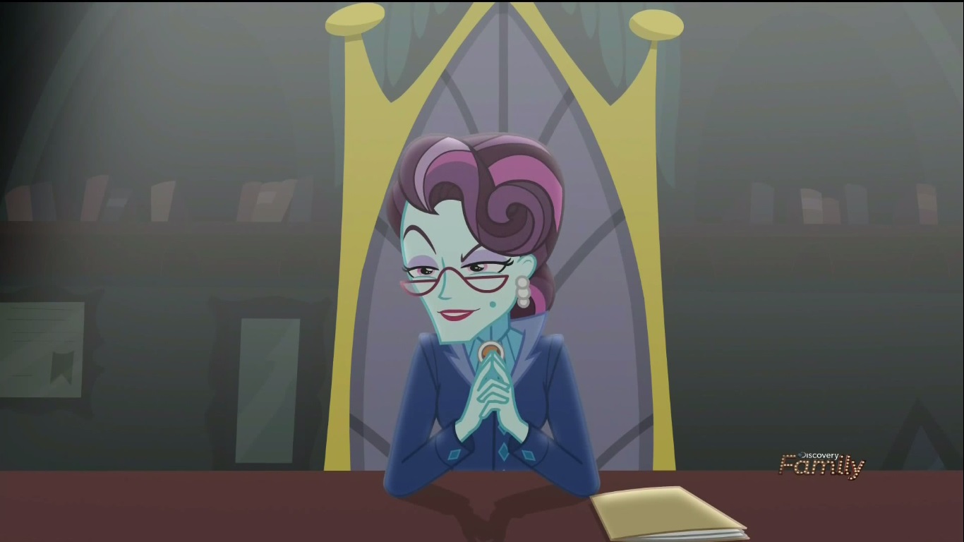 Fortunately, the effects of the device seem minimal in that it only takes the magic and doesn’t have the same effects as Starlight Glimmer’s cutie mark stealing technique or Discord’s corruption spell. She seems to be fine and will just be unable to transform until she gets her magic back. Twi-prep ends up wandering into the room (not all that fazed about having just sucked up some strange gas like substance) and runs into the Mane 6 who greet her thinking that she’s Twi-pony. It doesn’t take long for them to realize this is actually be the Twilight of their world, but before they can clue her in to what’s happening, she gets whisked away by Principal Cinch who’s still taking everything WAY too seriously and firmly believes that everyone at Canterlot High is a rat faced bastard trying to exploit whatever weakness is in Crystal Prep’s ranks. So on top of coercion, she’s fostering paranoia in her students in order to get them all riled up? This is how the freaking NAZIS got started!! Twi-prep doesn’t seem to be buying her crap, but then she’s too meek to hold her own opinion so who knows what she’ll end up doing. Sunset isn’t doing much better because she hasn’t heard back from Twi-pony yet (I’m guessing she’s too busy at Rarity’s shop opening) and doesn’t know what to do. She’s contemplating going back through the portal to Equestria (I’m guess it’s always open now) but unfortunately there’s a dark force lying in wait for her.