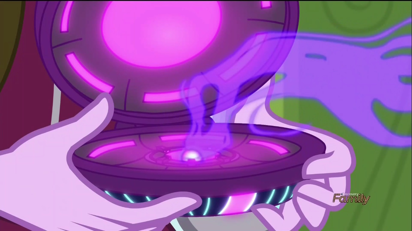 Twi-prep continues her search for whatever it is that’s making her compact go haywire and gets drawn to the music room where Rarity is fashioning up a storm. So much so that she starts to “pony up” as they put it which should REALLY give them a clue as to where the magic energy has been coming from. Sunset still isn’t getting the hint though and hasn’t heard back from Twi-pony yet, so for now it’s still a mystery. Besides, that’s not even the most important part of the scene. No, what’s REALLY important is that Twi-prep’s magic sensing device also doubles as a SOUL SUCKING TALISMAN FROM THE DEPTHS OF HELL!! Seriously! She makes a magic sensor, but also accidentally programs it to steal the magic from its source!? How do you even make that without realizing it!?
