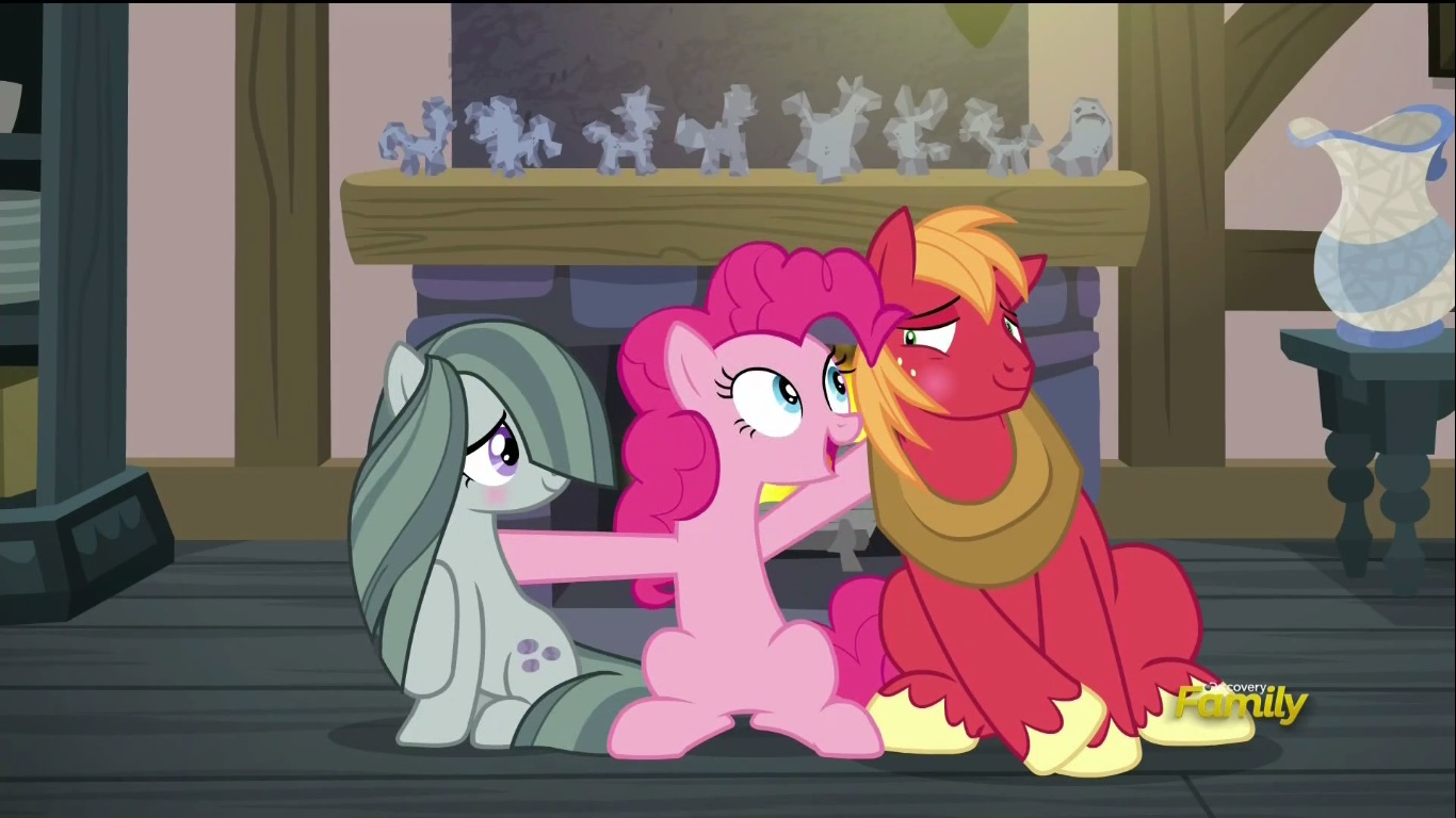 -There’s a popular fan theory that Pinkie moved out of the farm because her family abused her. I’m glad that the topic of what they see in Pinkie never really comes up. As far as the episode is concerned, there’s no bad blood between her and her family. The Pie’s intro is good at telling us everything we need to know about them without the need of going into too much backstory. Ma and Pa Pie are defined by their humbleness, Marble is a Fluttershy/BIg Mac hybrid, and Limestone has the most attitude. BTW, I thought it was a nice touch how Limestone’s behavior isn’t treated as something that needs to be dealt with. It’s very apparent that Pinkie learnt how to handle her a long time ago.