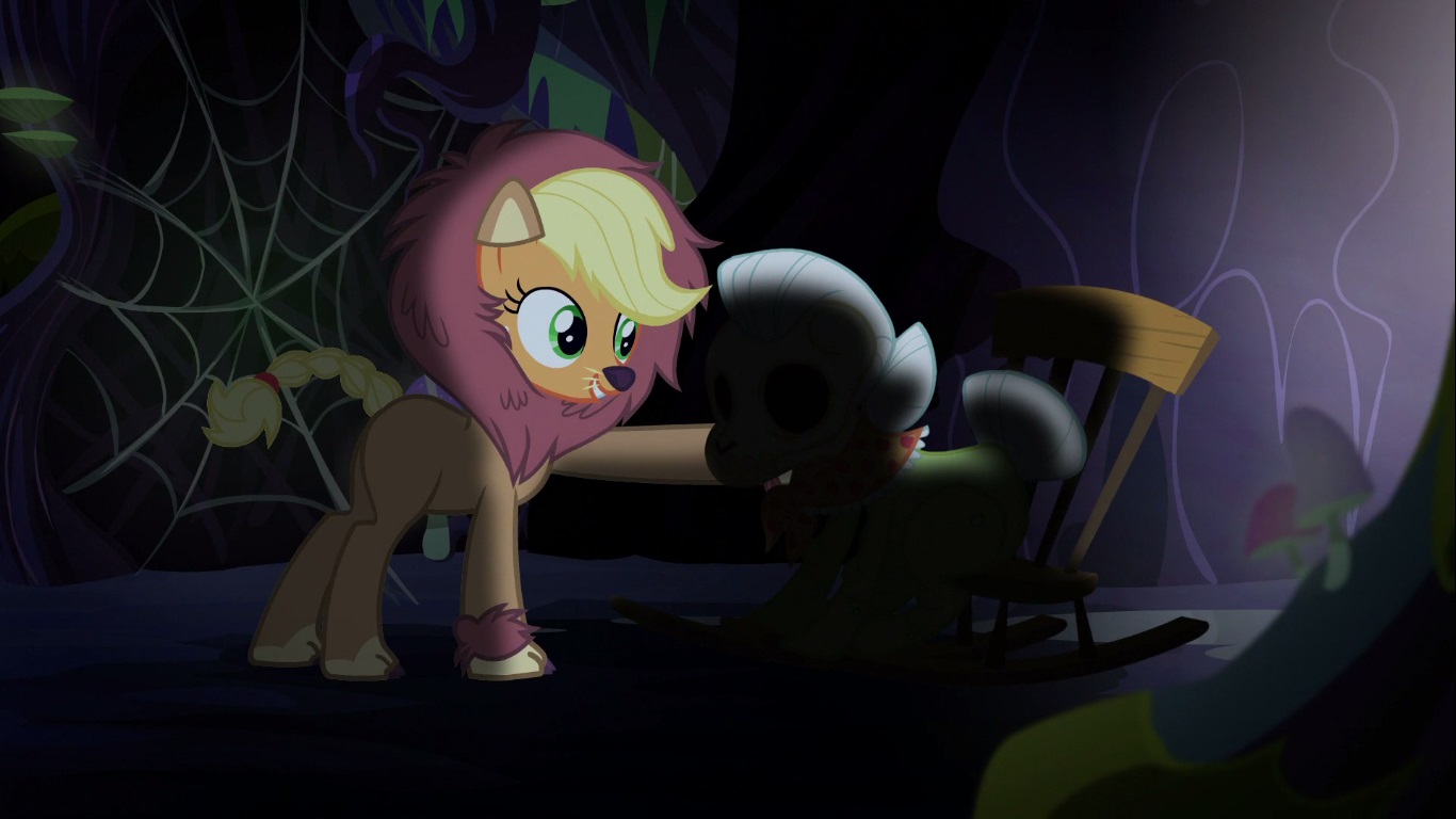 Their frightful fleeing eventually lands them in a giant hold (the PERFECT place to end up when getting chased) and whatever it is that’s pursuing them closes the hole so that they’re stuck there. DAMN!! I know Fluttershy wants to scare them, but Angel is coming up with some Cask of Amaontillado shit over here (written by Edgar Allan Poe-ny presumably). They look around for a bit and Applejack runs into the SKELETAL CORPSE OF HER OWN GRANDMOTHER ROCKING GENLTY IN HER CHAIR!! WHAT KIND OF HITCHCOCKIAN PSYCHO SHIT IS THIS!?