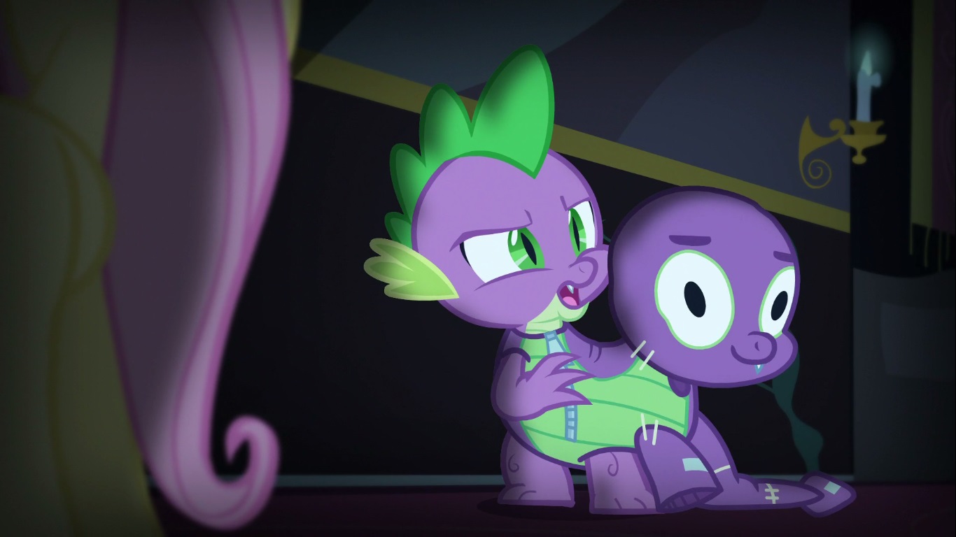 Getting nowhere fast in town (apparently buying vegetables in COMPELETLY IMPOSSIBLE right now) she heads over to Twilight’s Doom Fortress to see if she has anything stockpiled. Doesn’t seem like a great idea to go to a dark and empty (therefore spooky) castle all alone when you’ve already psyched yourself up for the terrors surrounding you, but then again I don’t have to go back to a physically abusive rabbit, now do I? After wandering the halls for some time, she eventually runs into a truly terrifying sight to behold. Spike’s costume is from a Farrelly Brothers film!!!