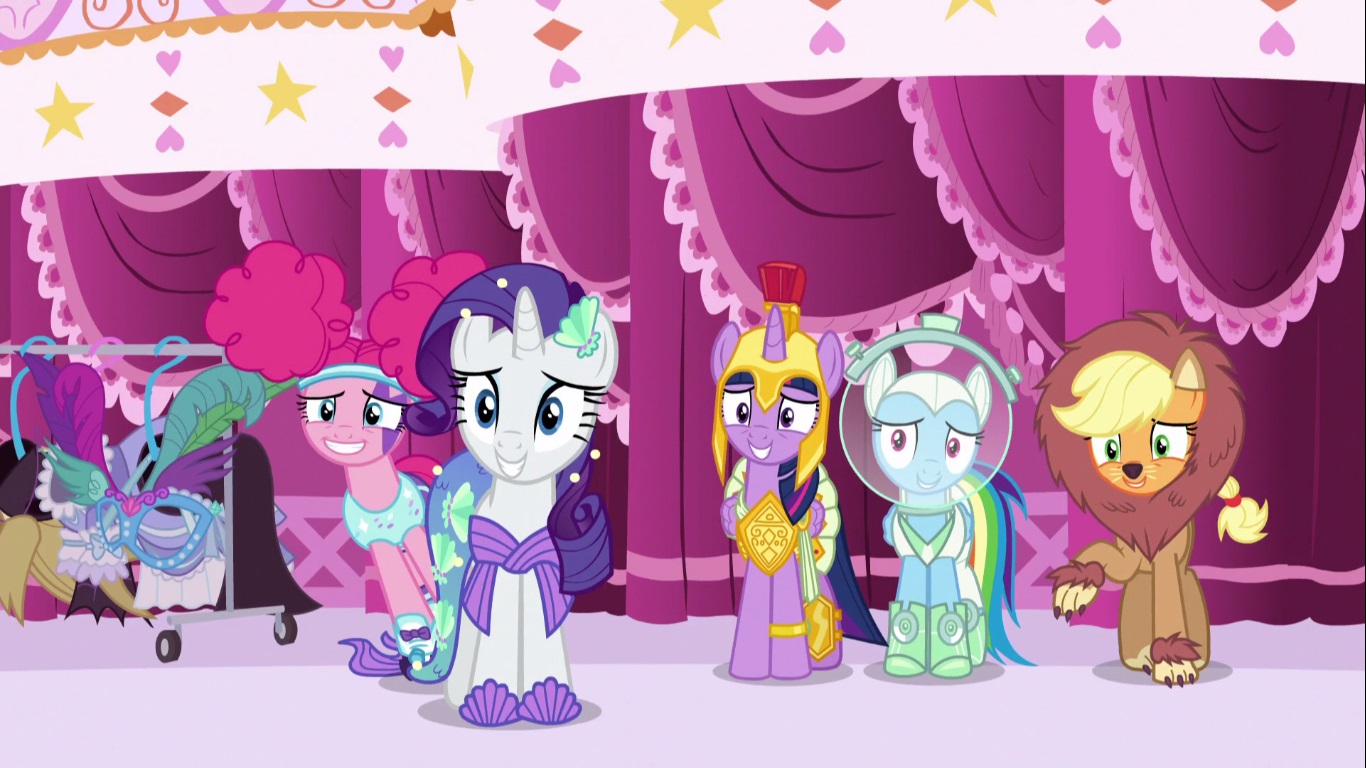She eventually settles on a black dress with nothing else which is supposedly a masquerade costume without the mask (kind of like what Frank did in that one episode of It’s Always Sunny) and everypony else pretends she put any effort into it. Their costumes by the way seem to be The Little Sea Pony, The 1980s, Spartacus, The Cowardly Lion, and of course Buzz Aldrin.