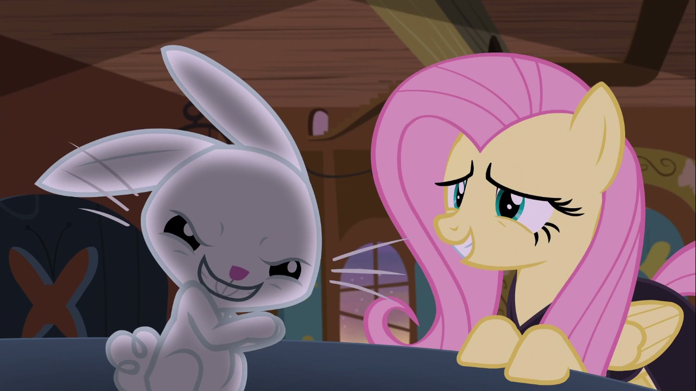 In all seriousness, I really don’t get the point of that visual gag. I like the reference there and if it means that SOMEONE now wants to know who Sailor Moon is or watches a Rumiko Takahashi series, well that’s a big win all around. Still, what does it MEAN? What relevance does five anime and manga references have to a world that hasn’t even established that either medium exists here? Hell, what relevance does it have to a HALLOWEEN episode? This probably will just be a one off joke so further examination might be pointless, but it’s baffling if nothing else. Clearly no one is having any fun so Fluttershy decides to let them spend their Nightmare Night doing what they enjoy rather than drag them down with her. You see? There’s a pretty damn good moral here! Not everypony has to like what you like and you should always respect when people aren’t comfortable doing something! That would be a good note to end this episode on… but we’ve got eight more minutes to kill, so let’s get into some shenanigans!! Despite realizing that she’s not cut out for Nightmare Night festivities, she gets pressured by Angel to try once again to scare her friends and even has some ideas of his owns on how to do that.