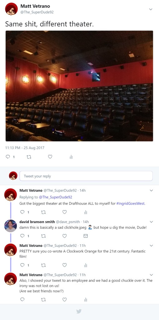 Before the movie started, I took a picture of the theater which was COMPLETELY empty at the time (only three or four people filtered in a few minutes later) and I sent a tweet about it. Once the movie was over it turned out that David Branson Smith the co-writer of the film had tweeted back and I couldn’t have imagined a more fitting way to end the experience. There are plenty of movies I liked this year like Kidnap, Guardians of the Galaxy Vol. 2, and Free Fire, but this movie along with Get Out are easily the ones that have risen above the rest and hopefully this film will be recognized as such once everyone starts doing their year-end tallies. This isn’t playing in NEARLY enough theaters and I wouldn’t recommend going THAT far out of your way to see it (I drove forty minutes and I think that’s about as far as I’d recommend going) but if you can, you should ABSOLUTELY check this out. It may not be a movie for everyone, but I hope this ends up finding its audience who will enjoy this immensely. Hopefully not TOO much though, otherwise they might have missed the point of the movie…