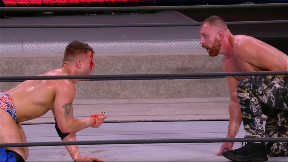 The feud between Moxley and MJF hasn’t always been a slam dunk as MJF’s election gimmick never really worked for me, but him and Jon trading barbs and cutting promos against each other has been some of the best moments in the last few weeks of Dynamite, and with so much at stake here (Moxley’s title and MJF’s winning streak) there’s almost no chance that this match will disappoint! Now MJF is good, but it becomes clear early on that he seems to have no chance here as Moxley tears him apart whenever he can get his hands on him. That wouldn’t be a particularly interesting match though, so after about five minutes of devastating (and humiliating) offense, Wardlow manages to distract Moxley just long enough for MJF to drop his left arm right onto the apron; potentially dislocating the shoulder and cutting his offensive capabilities in half. One of the more frustrating things about MJF that makes him such a great heel is that luck seems to be on his side whenever he’s in the ring, so matches that SHOULD be a sure thing for his opponent somehow find themselves to be way more competitive due to some haphazard circumstance, and in this case he got lucky with that arm spot and works Moxley over for several minutes trying to make it worse. What’s CATHARTIC about MJF though is that his Achilles heel is that he’s cocky which rears its ugly head at one point after throwing Moxley out of the ring. He fools Moxley out to mock him and as he does, Moxley charges him and bashes his face into the ring post. MJF is an absolutely bloody mess due to a wound on his head which has certainly shaken his resolve, but Moxley can’t exactly capitalize on it due to his bad left shoulder. If it was me I wouldn’t have had MJF get so bloody so early in the match as his face is RIDICULOUSLY read but it stays that way for what, twenty more minutes? It feels like something that should be a bit closer to the finish rather than the one of the many turning points in the match.