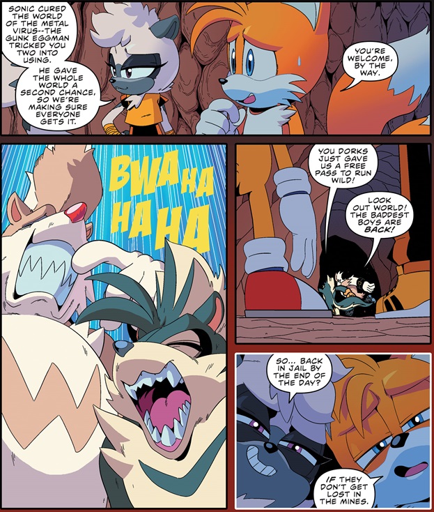 Sadly this is a very brief part of the issue as we swiftly go back to Sonic’s dimension (I’m just gonna start calling it Mobius) where everyone else is trying to get their bearings after the devastation of the Zombot virus. It’s a bit of a shame because I like what they’re doing with Sonic and Blaze is a character who should be in this series a heck of a lot more, but the writers really knocked it out of the park here so I’m not going to complain that I’m getting good scenes from ALL of the characters instead of just my favorite one. We see Amy in the absolutely ruined remains of Restoration HQ with nothing more than natural lighting and a desk full of random papers to work with, and it’s clearly not something she’s about ready to deal with. If only there was someone out there who liked organizing things and looked better in a dress suit! Luckily for her, Jewel the Beetle knocks on… well whatever’s LEFT of the door, and offers her services to The Restoration which Amy accepts with open arms and a stack of papers! The Restoration has definitely felt like a vestigial element in this series as something of a replacement for The Freedom Fighters which was such an important aspect of the Archie series. The problem with it is obvious in that it was a secondary element to just randomly stick established characters into (to essentially waste their time) instead of something built from the ground up for the new characters in this book, and hopefully Jewel taking over will be the first step in making The Restoration more than that. Speaking of new characters, Tangle is out with Tails to find people who have been displaced by the virus (apparently you can get pretty far going at a Zombot shamble), and we cut to them coming across Rough & Tumble. Somehow they are getting a free pass after all this which I’m pretty sure is the reason the Zombot crisis happened in the first place what with Metal Sonic being set free to turn Eggman back into his evil self, but then again they keep letting Eggman get away with this nonsense and considering our CURRENT political climate, letting monsters get away with everything under the sun feels a lot less farfetched…