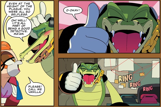 We also get scenes of Eggman Scheming that isn’t all that interesting, but we do get a brief update on Dr. Starline who’s alive and well in some sort of Eggman warehouse plotting his elaborate scheme to show his not-so-good mentor that he was right the whole time and get that big thumbs up from his daddy figure which only makes me wonder exactly what the heck happened in HIS life that led him to this course of action. Seriously, how many hugs did his father not give him that he now idolizes the biggest douchebag on the entire planet? All I’m saying is that if they’re going to do another mini-series than that would be a good place to start, but for now we leave the evil-doers to their machinations to spend some time with the Chaotix who are… well in the midst of a chaotic situation. It’s not a particularly ENTHRALLING scene as the Chaotix are just kind of running around frustrated about their workload now that everyone is trying to find their missing loved ones, but things get… shall we say INTERESTING when Cream, Vanilla, and GEMERL show up, and it’s STRONGLY implied that Vanilla is into the big strong scaly type!