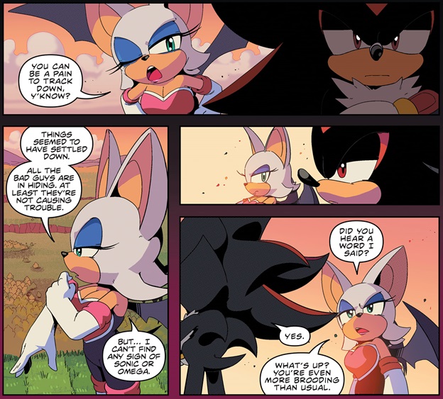 See, this is what I’m talking about! For like twelve issues there I couldn’t care less about anything that was going on because it was all about this ONE BIG CRISIS that frankly felt old and played out a good decade before they started doing it here. However, in ONE issue we’ve got like what; three or four intriguing plot threads that I’d like to see play out? Seriously, a date night between Vanilla and Vector would be ten times more interesting to me than yet another punch-up or angst ridden zombie story. Speaking of angst! Shadow is… somewhere, standing on a floating rock and just staring into the distance. Rouge shows up to try to give him an update on the current events post Zombot-pocolypse, but as you’d expect (and as she clearly KNEW would happen), Shadow just keeps staring into nothing; lost in thought and failing to find any interest in the world around him.