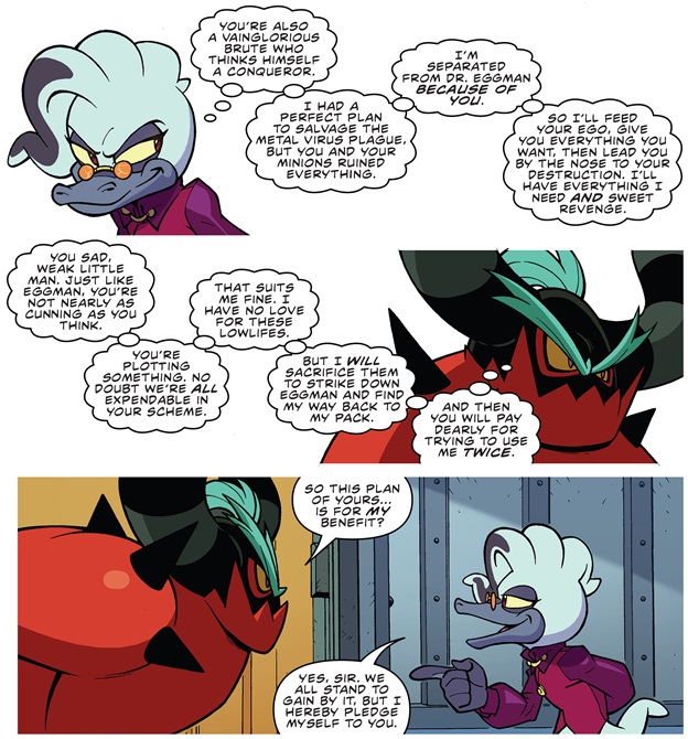 With almost no effort, Dr. Starline is able to break into the prison which is yet another aspect of this that reminds me of Arkham Asylum, and when he gets to the EMPTY CORRIDOR holding all the bad guys, he makes his offer. For Mimic, he will wipe his information off of Eggman’s computers which I guess will free him from Eggman’s vendetta against him, for Rough & Tumble he’ll build brand new weapons, and for Zavok… well he offers his fealty to him which seems a bit cloying and obvious, but since both of them want to destroy the other as swiftly as possible this temporary alliance will prove beneficial.