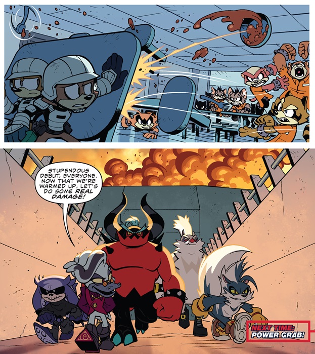 With the alliances in place and the back stabbing knives in their sheaths, all that’s left to do is get back OUT of the prison which proves to be fairly difficult as the alarm has gone off and all the guards are zeroing in on their location. The escape scene is pretty well executed as it does the job of reintroducing everyone to these villains’ powers and it lends them a modicum of credibility despite having just gotten their butts kicked by Sonic and the gang. Rough & Tumble live up to their name by making short work of the armed guards while Mimic turns into the warden to confuse the situation. Everyone else gets cleaned up by Zavok with his TECHNOLOGY CONTROLLING POWERS and Starline’s job is to find them a way back out. They manage to make it to the security room and he plans to deactivate all the alarms, but instead Zavok insists that he release all the prisoners so they can slip through in all the chaos. Yes, apparently Mobius has just as dreadful a criminal justice system as we have in the US as there are MORE than enough furry ruffians to try and stab all the guards in sight. What I want to know is why all these dudes are wearing eyeshadow but sadly we don’t get an answer to this and instead we come to the end of the issue where our Villains are walking away from an explosion like a bunch of cool guys!