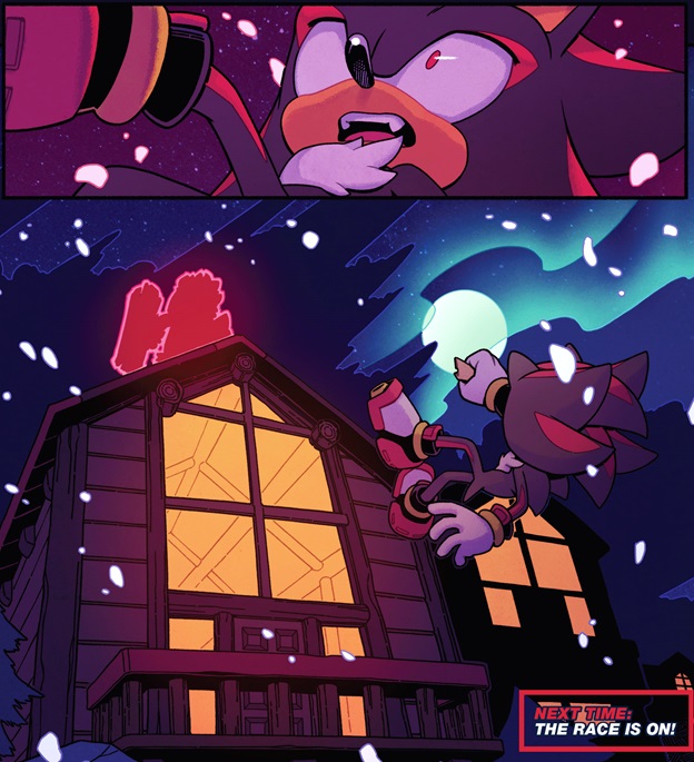Clutch seems fully aware of not just Rogue’s true identity but her underlying motivation and so gives her an offer that would scratch her tweener good/bad itch.  If Cheese wins the race tomorrow, than he’ll offer Rogue ANYTHING she wants in exchange for them; intentionally disregarding the fact that Cheese may not be hers to give away.  Rouge tells Clutch she’ll have to think it over, but more than likely it’s just to placate him while she puts her own plans in motion.  We’re not sure what it is exactly, but she leaves Omega’s head among Clutch’s junk after whispering the plan to him so that we’re left in the dark.  As soon as she leaves the room however, she comes across a person wearing a very large parka that obscures whoever is underneath, but Rogue recognizes them immediately and from the looks of things it’s not a happy reunion.  Moments later, we’ve cut to the outside where Shadow the Hedgehog is outside watching the hotel (perhaps he’s a part of Rogue’s master plan!?) and spots the stranger leaving.  He seems intent to stop this individual, but they have some strange powers that give them the upper hand in the fight and they whack Shadow across the midsection with a giant log with the last thing we see being Shadow’s stunned face of recognition as he falls off the building; presumably to his death, but we’ll have to wait for the next issue to find out for sure!
