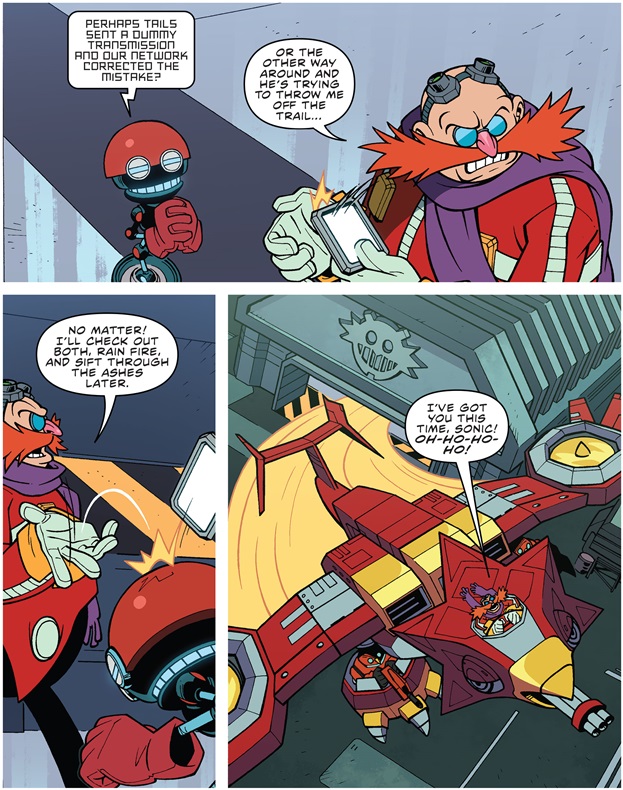 With daggers sharpened and ready to be unsheathed, Starline moves forward with his plan without the slightest clue as to what’s happening around him; putting him the same company as Rough & Tumble who are not in on Zavok’s plan and spend most of their time coming up with new rhymes for their entrances. Everything so far has been solid and Rough & Tumble are quite funny as comic relief, but it doesn’t quite have the same spark as the last issue. Sure, we’re heading towards some sort of decisive confrontation where Starline is going to have to pay the piper, but the path to that is perhaps a bit TOO clearly laid out. Because of this, the subsequent action scene where they attack the Eggnet Facility feels like we’re going through the motions where the last issue’s big action set piece had a bit of spontaneity to it that kept it fresh. Heck, it goes so well that you almost wonder why the bothered getting the Power Cores from the last issue as nothing they do here seems to have required that extra boost in power. Fortunately it doesn’t take THAT long for them to get the MAIN COMPUTER ROOM which kind of looks like the Apple version of Cerebro, and Starline gets to work on his masterstroke. First, he needs to deal with Eggman who has surely been alerted to the goings on in the center of his Eggnet and he tries to throw them off his trail like he did in the last issue by making it look like Sonic attempt. Just like last time however, Eggman doesn’t seem to be buying it and is in fact heading to our anti-heroes’ location with them being none the wiser.
