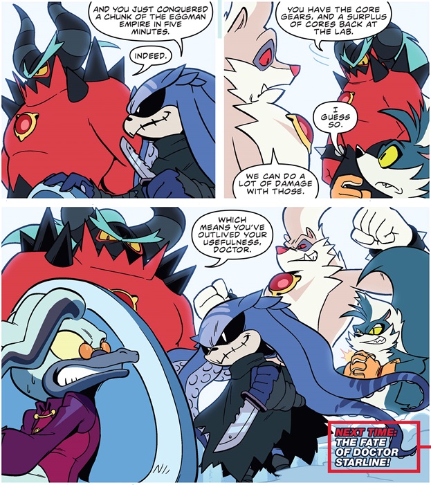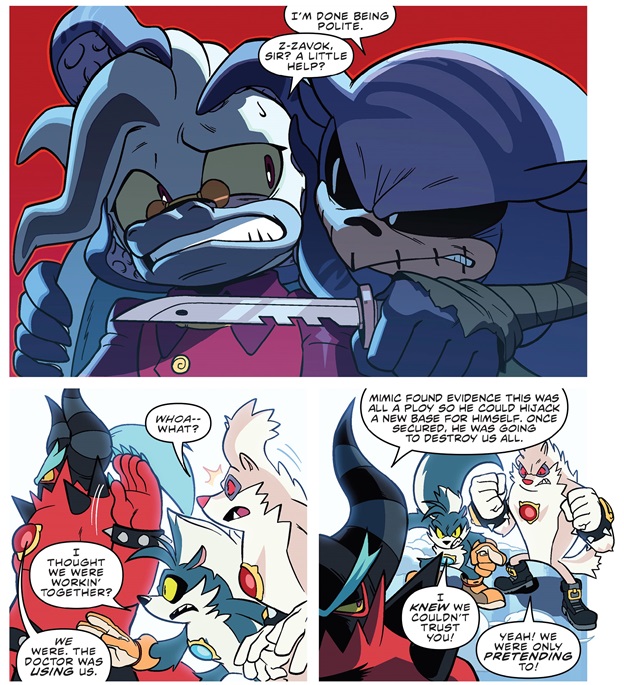 With that threat on its way as well as the impending betrayals of Zavok and Mimic, the screw are definitely starting to tighten as Starline continues along his merry way with whatever he has planned here. Speaking of which, we still don’t really know what he wants out of all of this, do we? We saw the tubes of green liquid a few times at his base, but we still don’t know what’s inside of them or how they’re going to get him back in Eggman’s good graces, and the only hint we get are the words Egg Base Sigma which is the place that Starline is currently using as his base of operations, so he must be uploading SOMETHING from the Eggnet to the tubes there. My three guesses are Scratch and Grounder, Bunnie Rabbot and Uncle Chuck, or TWO Shadow the Hedgehogs that he’ll have compete against each other to find out which is the most ambivalent against good and evil! We won’t be finding the answer to that in this issue however as now is the moment that Mimic decides to make his move, and this dude doesn’t play around!