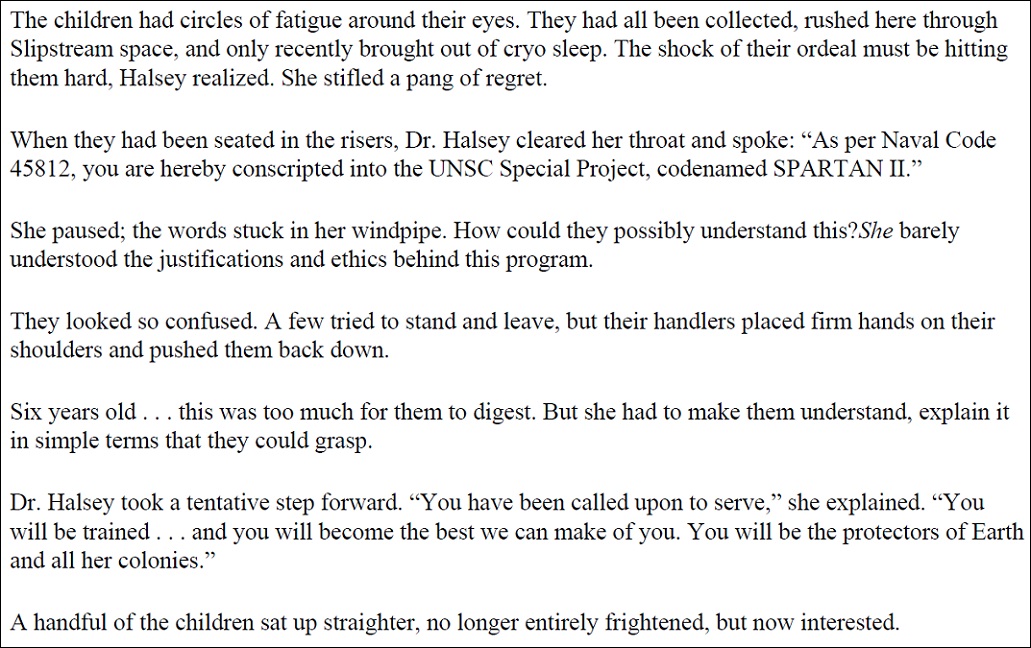 Thankfully it gets better after that first third once it’s more about setting up the Covenant threat rather than the despicableness of the Spartan program, but then we run into the second problem I have with the book which is the character of John; AKA Master Chief. It took me a while to REALLY put my finger on it, but the fact of the matter is that John comes off as SUPREMELY naive and about as green as the armor he wears. This would be fine if it was contained to just an origin story as I don’t expect him to burst onto the scene fully formed, but the fact is that the book comes right up to the start of the first game which doesn’t leave a lot of room for him to develop the grit, experience, and age that came across when I was playing the game. Take the part in the book where we see the Spartan’s in a proper mission for the first time which is a Covenant attack on a human colonized planet. It’s probably the best sequence in the book as the stakes are set up quite well and the desperation of the UNSC troops is evident before The Spartans come in and clean house with John and his troops being tough, professional, and getting the job done with the heroic brutality that you’d expect. And then right as the mission comes to a close…