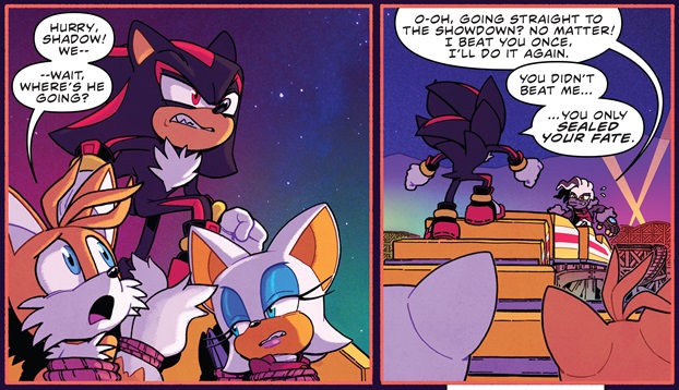 The issue begins with Starline basking in his own genius at stealing The Green Goblin’s idea from the first Spider-Man movie; namely to make the hero choose between their duty to the innocent and the safety of their friends! If Sonic and Shadow don’t go stop that avalanche he caused, the Chateau is going to be destroyed along with everyone inside! Naturally Sonic decides to save the people, but Shadow being the paragon of ambivalence towards good and evil doesn’t take a second look backwards as he stomps his way towards Starline. Gotta say, as much as I’ve found Shadow to be an unbearable and cringy bore in every other piece of Sonic media, I think the writing for him has bene top notch and gives a bit of depth to a character that only exists to be everything Sonic is not. He’s not happy go lucky, he doesn’t make friends, he’s just dark and brooding. However, this gives him a bit more personality to work with and his single minded pursuit of Starline for humiliating him earlier in this arc feels quite genuine nad in its own way kind of engaging.