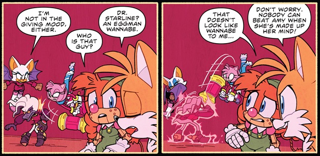 We’re back for another ironically late recap for a comic about a character is super-fast! Now that the Bad Guys mini-series is complete and we know how Dr. Starline survived to the end of that, we can focus on what he plans to do now that he has tails and Rouge in his grasp! Will he succeed in his latest scheme, whatever that happens to be, and will this mini-story arc come to a satisfying conclusion? Let’s find out!!