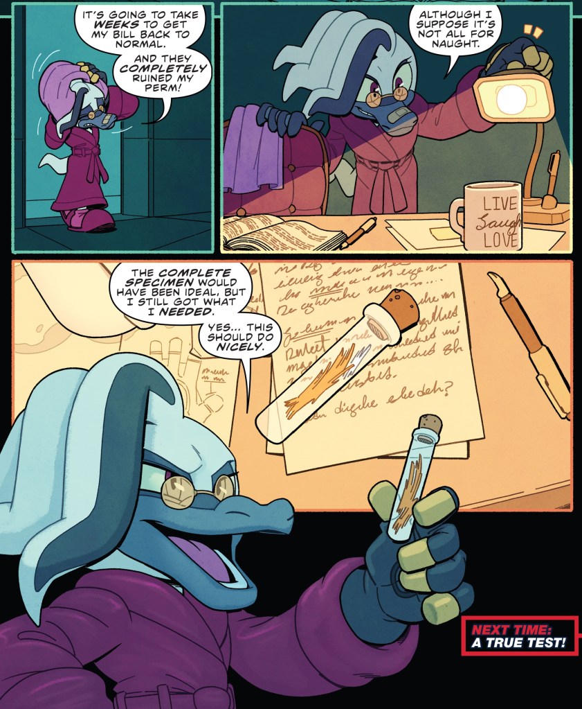 Naturally Starline gets his butt kicked and is swept away by the one tiny bit of the avalanche that breaks through a window. All is well as our heroes return to Tails’ workshop to finally put Omega together with the help of Belle who proves to be just as good at robots and blueprints as she is at picking locks! In fact, she’s a little TOO good which Tails points out as she seems to have no problem decoding Eggman’s blueprints which is the whole reason he and Sonic went to that Eggman facility in the first place where they found her. She continues to insist that she was not created by Eggman but is still tight lipped about her origins which at this point only seem to indicate something rather sinister and I’m curious exactly what the plan is with her. They’ve done dark material in the past with the Zombot arc, but will they have an answer for her dark secret that creates some serious drama? I’m inclined to say no as they didn’t even do that with the Bad Guy mini-series, but I guess time will tell. We also get to see Dr. Starline who seems to be none the worse for wear after getting plowed by a torrent of falling snow, and he seems to have completed his objective; in that he has some of Tails’ fur in a jar. Oh no… I guess? And so the issue comes to an end with Starline getting ready for the next step of… whatever this bizarre plan of his is.