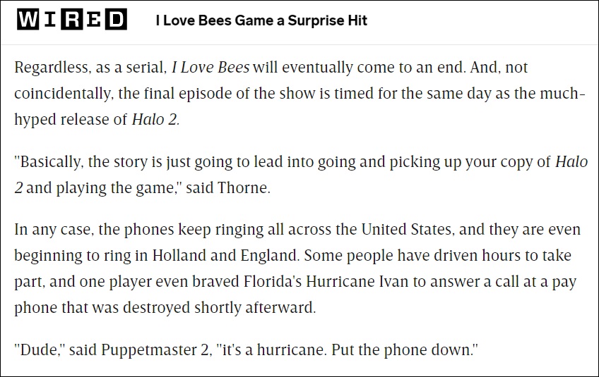 The next leg of this story is perhaps the most famous one where coordinates and times were secretly uploaded to the site for people to decode. These would reveal time and location of phone calls on payphones (look it up kids) that someone would have to be there to pick up and answer I Love Bees trivia to get another clue. How many clues did they have to unlock? SEVEN HUNDRED AND SEVENTY-SEVEN! That’s right; payphones across the US (and a few in London) were ringing at random times for weeks with one of SEVEN HUNDRED AND SEVENTY-SEVEN CLUES that sure enough fans were there for and pieced together. A lot of these locations were swarmed with up to fifty or so people who wanted to be a part of the experience, and the most notable story from this is when someone was at a payphone in Florida during Hurricane Ivan where the operator on the other end just broke character and told them to find safety.