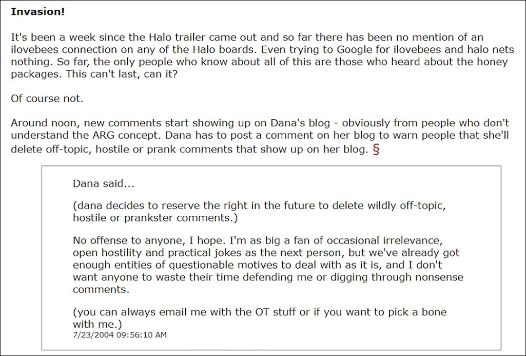 The Wiki helped me piece together the in-universe Halo narrative, but for the ARG itself and the story of people solving the puzzle I turned to a video by Rocket Sloth about the topic and frankly I may go back to his YouTube page in the future considering how much Halo content he has on there. A lot of people know I Love Bees from the Halo 2 trailer that no so subtly dropped the website link at the end of it, but this wild story started way before that with 42 Entertainment sending jars of honey filled with random letters to known ARG enthusiasts. For a while, people in the ARG community were trying to unravel the mystery via data stored in corrupted photos, messages left by the site’s admin, and all sorts of line by line decoding, and I applaud those who had the patience for it, but it’s just not for me. Funnily enough though, it ALSO wasn’t for a lot of the Halo fans which I found to be one of the more interesting aspects of this story. During this period of time where I Love Bees was just known in the ARG community and didn’t have any clear connections to Halo it was working as best as 42 Entertainment could have intended it to, but when that game trailer dropped and a bunch of twelve year old FPS fans went to the website to find a bunch of nonsense about bees and mysterious characters like The Pious Flea, well things kind of devolved. Not in a SIGNIFICANT way as I Love Bees continued, the ARG fans were still making progress, and there were certainly enough Halo fans jumping on now that got into the spirit of things, but there were a lot of people who weren’t playing along and just wanted Halo news or whatever prize they assumed were at the end of all this.
