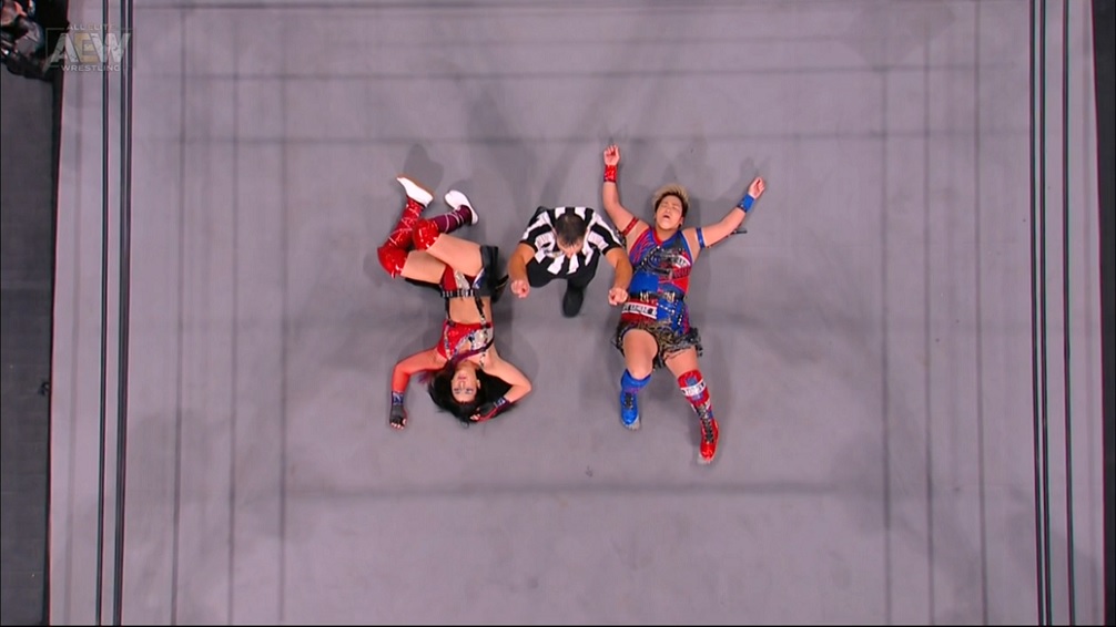 Now originally this was supposed to be Baker and Rebel (Not Reba) teaming together, but the latter supposedly got “hurt” and comes out on a crutch, so Baker signed a Doctor’s note and Tony Kahn allowed her to choose someone else to be her partner and frankly she couldn’t have gone with anyone better! As much fun as Rebel (Not Reba) can be as an instigator, having Maki Itoh show up as a surprise on this show is an AMAZING way to kick the show off! She got some attention when she was announced for the women’s tournament, but it was her very fun social media made that made her a fan favorite right off the bat. She was knocked out in the first round unfortunately, but now she’s here proves without a doubt that AEW needs to signer her yesterday! Why is she so great? Well first, she comes out here and singes her ENTIRE entrance theme which is definitely a good start, and as soon as she gets in the ring with Thunder Rosa she flips her The Bird with both barrels. Yeah, I think she’s going to be my favorite wrestler of all time! Now admittedly she looks a LITTLE bit stiff at first as the initial minutes against Rosa feel a bit stop and start, but as soon as they get a flow going Itoh proves to be an absolutely BRILLIANT professional wrestler! She’s got by far the most expressive face in the women’s division here at AEW, and she reminds me a little bit of Eddie Kingston of all people. It’s just an overall presence of nastiness and a flair for the comedic as she puts on a CUTIE POP IDOL image but she fights like a total heel and takes cheap shot whenever she can; going so far as to fake cry so her opponent lets their guard down. And yet, despite being such a craven and obvious bad guy, I don’t know WHO could possibly boo her!