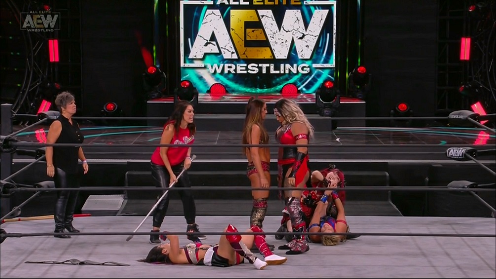Eventually they get up but are beyond the point of caring that they just holding hands and using their free one to bash the other in the face; back and forth for like a minute until Shida eventually falls down. Ryo’s victory in this little exchange allows her to do a suplex and a spear, and she then goes to the top rope for the leg drop which she manages to land and goes for the pin, but Shida kicks out at two. A similar exchange from Shida follows soon after with lots of Running Knees and Falcon Arrows, and yet Mizunmai won’t stay down. Shida in her desperation pokes Ryo in the eye and hits another Running Knee, but Mizunami reverses the pin attempt on her into a pin of her own and gets a close two count. Things are definitely hitting a fever pitch between these two which and you are no doubt expecting an exciting conclusion to the match, but I must be the bearer of bad news here and say that the match ending is kind of a squib. Shida couldn’t put Ryo away with all those running knees and all her Falcon Arrows, so it makes sense for her to use a DIFFERENT move to finish of Ryo, but what wins her the match is a not especially great looking Corkscrew Knee Strike. It’s not a BAD move and it certainly connects, but it looks so much lighter than the dozen or so running knees she already gave, so for Ryo to stay down for it was pretty unexpected and a bit of a disappointment. Still, the match was a darn good bout between these two women. It’s perhaps not the most EXCITING match on the card, but definitely one that was well executed despite a slightly underwhelming ending. Fortunately the post-match angle makes up for it as Nyla Rose (accompanied by Vickie Guerrero) rushes the ring and starts attacking the both of them. But she’s not out here alone, however! Britt Baker, Rebel (Not Reba), and even Maki Itoh run out to sow even more chaos on stage!