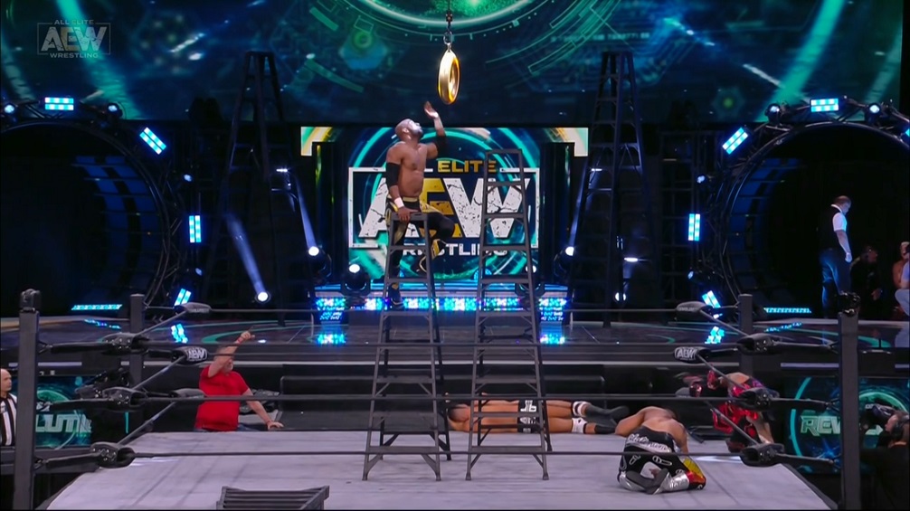 The most that Caster seems to do in the match is get a boom box from an interfering Jack Evans which is momentarily stymied by Ten The Creeper running in and flattening out Evans, but Caster gets it anyway so I don’t know why they bothered with Ten, nor do I know why they bothered with the boom box as it doesn’t play into the match any more than anyone else who runs wild for a moment. Cody gets hurt by the aforementioned Canadian Destroyer and is dragged out to the back for most of the match before running back in towards the end whipping people with his weight bell which I guess is TECHNICALLY legal as ladder matches are No DQ, but it doesn’t really play into the finish either. Mostly, it’s a showcase of big moves and scary bumps which are certainly both impressive and terrifying. Cody takes a Superplex and a Top Rope Elbow Drop during his return which probably isn’t helping much with his shoulder, and Max Caster takes a Blackout from Archer RIGHT onto a ladder! That takes them out for a bit, but then we’ve got Penta hitting Jake Roberts with a Super Kick for interfering, we’ve got a VERY impressive Top Rope Cutter from Cody that he lands on Penta while he’s hallway up the ladder, and Cody of course takes even more damage with a few chair shots from Penta. He REALLY should have tossed the chair out of the ring or kept using it for himself because Sky runs in and picks up the ladder to attack him as he’s halfway up the ladder, and Cody tries one last desperate climb up the ladder to try and beat Sky, but Sky yanks the bad arm and pushes him off the ladder. With no one else nearby, Sky is finally able to grab the ring; winning a shot at the TNT title. It was pretty much everything you’d expect from a ladder match; both good and bad. You’ve got fantastic workers here so nothing looked too sloppy, but ladder’s a terrifying variable to throw into a match and it’s hard to brace yourself or take a bump safely with those things in play. I haven’t heard anything about someone getting hurt but Cody’s shoulder problems ARE real and this is the last kind of match he should be doing while he’s still healing. Sky winning was probably the best option as he could definitely use the push, and a match against Darby Allin will certainly be an amazing (and slightly safer) sight to behold!