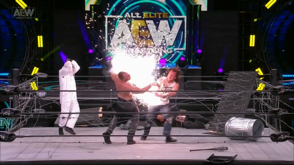 For the rest of the match, which uses COPIOUS amounts of barb wire, the story is that Moxley’s here to hurt Omega and is less concerned about winning, so while he gets his licks in on Omega they come at the expense of his own health. Omega isn’t tearing up the barbwire to wrap around himself to make his punches hurt more, but Moxley can’t WAIT to do something like that! When Omega tosses Moxley into one of the explosion triggers he makes sure he’s far away from it, while Moxley will go head first into it as long as some of the splash damage hits Omega, and he certainly ends up paying the price for it in just how much blood this dude spills throughout the match. There is one bit of cleverness from Moxley however in case you thought he was just fighting with tunnel vision the whole way through. Kenny hits the One Winged Angel and has him in a pin which he surely can’t kick out of, but he’s close to the ropes so he puts his boot on the trigger and lets himself and Kenny eat the explosion which was enough for Kenny to break up his own pin. That was perhaps the most interesting use of the explosives in the match as every other time is just a fun little punctuation to a series of moves, and the match itself definitely works if you want yet another blood show from these two. I don’t remember if the Lights Out match they had at Full Gear 2019 was longer than this, but this definitely felt WAY shorter and gave us some solid moves in between the barbaric devastation. So does the gimmick ultimately work? I’m going to say that it does as long as you don’t take it too seriously and I think that if AEW wants to do something like this again they should leave the word DEATH out of the marketing as it’s far too serious for what they seem to be able to pull off. At some point towards the end of the match the two of them are bloody messes without much in the tank but it looks like Moxley MIGHT just have a bit more to work with and may just win this match. It’s at this point that The Good Brothers come in to try and cause havoc for Moxley who DOES manage to fend the two of them off, but not before they hand Omega an EXPLODING BARB WIRE BASEBALL BAT that he smashes Moxley across the chest with! You see what I mean about trying to take this seriously!? Omega would be up on murder charges right now if those explosions were anything more than fireworks!!