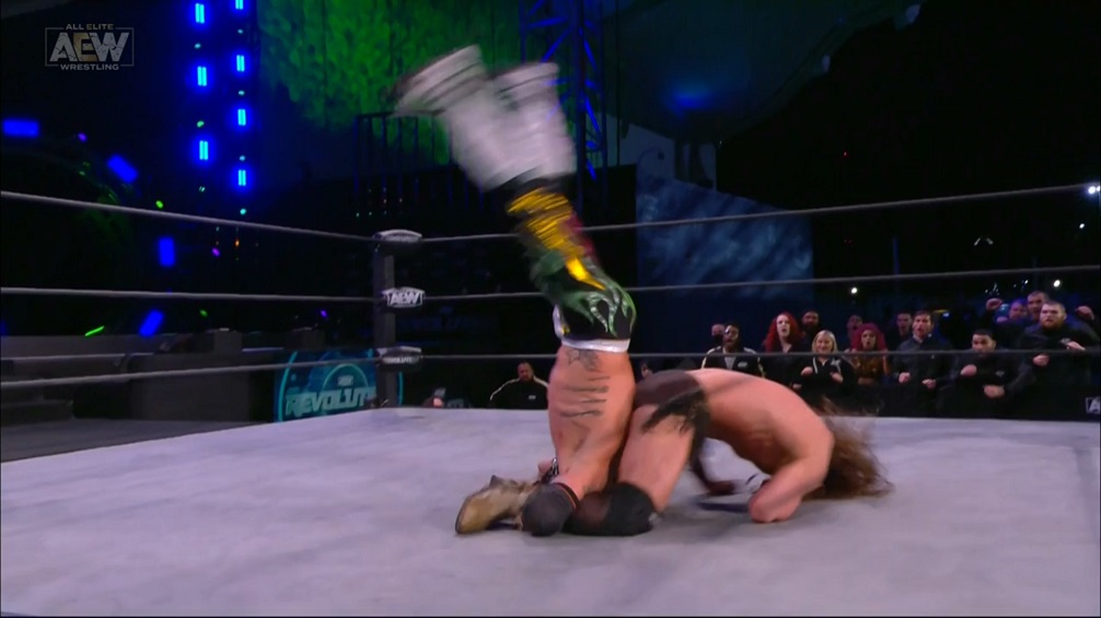 In what has to be the biggest turnaround for me in the last few weeks, I was not into the Hardy/Page angle at all for most of the time they told it, but when they Big Money match was announced for Revolution it really started to click and it became one of my most anticipated matches on the show. Now Hardy isn’t exactly as strong or as spry as the strapping young Hangman, and he’s not about to throw a quarter’s worth of earnings down the drain in a fair fight, so his big Hail Mary at the start of the match is to work over Hangman’s hand. He’s knocked to the outside but manages to throw Page’s right hand into the post and then follows it up by crushing it between the ring steps and the stage which neutralizes not just his Buckshot Lariat but a big chunk of his offense. Because of that, most of the match works at Hardy’s speed which isn’t slow or anything, but Page having to grab his arm after every big move definitely drags things out a little bit while Hardy catches his breath. Still, they manage to land some very impressive big moves, such as a Death Valley Driver from Page, a Twist of Fate on the floor from Hardy, and we even get a Moonsault from the post to the floor which in this ONE instance is the one of the LEAST risky moves go for as it doesn’t involve using Page’s hand!