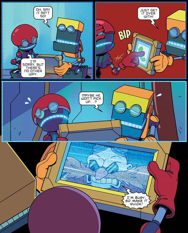 I can only hope that whatever big reveal they have planned for us will make up for keeping everything so close to the chest with her, but I doubt that IDW is that ambitious with this franchise. You know that alternate ending to Terminator Salvation where the Sam Worthington Bot actually ended up KILLING John Connor? Something like that would work perfectly here where she betrays Sonic or yanks too hard on Tangle’s tail, but here I am wishing a children’s comic was more like a series of dark and bloody sci-fi films, so perhaps we should put the speculation on hold for a moment and focus on what ACTUALLY happens in the comic. Tangle trusts Belle to not stab her in the back (at least for the time being) and continue to skulk around the facility while Sonic and Crew find themselves in another layer of this fake reality; one that looks like one of those makeshift Nuclear Test towns. Sadly seeing Sonic and crew try to survive a nuclear explosion by climbing into a refrigerator is not about to happen as something THAT destructive is a bit gauche for Eggman, so instead they start getting chased down by swarms of misshapen and cobbled together badniks. They hold up inside one of the houses and start barricading it like we’re in the opening siege of Resident Evil 4, and to make matters work the appliances start to laugh at them. See, this is why Eggman is the best! He doesn’t just taunt his foes; he does it while speaking through a branded toaster!