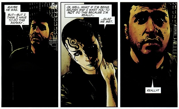 Yeah, who wants to take a guess that “real” music is a bunch of old dad stuff; mostly by a bunch of white dude with questionable relationships to women? It all points to a general problem I’ve had with the Halo media I’ve engaged with up to this point which is the constant deferment to military might over every other aspect of humanity. The games leave room for you to imagine the world that they’re fighting for and the people that need to be saved by Master Chief going that extra mile, but then you get to stuff like this that doesn’t seem to WANT a world for the UNSC to be fighting for; they want a world that exists only so the UNSC can fight. Ideally, a war should be fought not to show our power to but to protect our people and to protect their happiness. Humanity should survive to SAVE its frivolity and culture; not IN SPITE of it. You should know that, famous comic book writer Brian Michael Bendis! He’s the only one listed as the writer on these, but who knows what marching orders Bungie was handing out for this series so I’m willing to give him some benefit of the doubt here and it’s not like VIDEO GAME DEVELOPER Bungie has any higher ground to stand on when it comes to pointing and shaming other forms of entertainment. Well now that I’ve got THAT out of my system, the rest of the book doesn’t fare much better. Nothing ticked me off like that one page did, but the rest of the comic is just kind of dour to read and ugly to look at. I can’t put my finger on it, but the deep shadows and constant focus on faces make the characters look like they were rendered with a 3D modeler and then someone drew details on top of it. It’s a disquieting style that plants itself right in the uncanny valley and it never stopped looking weird to me throughout the four issues.