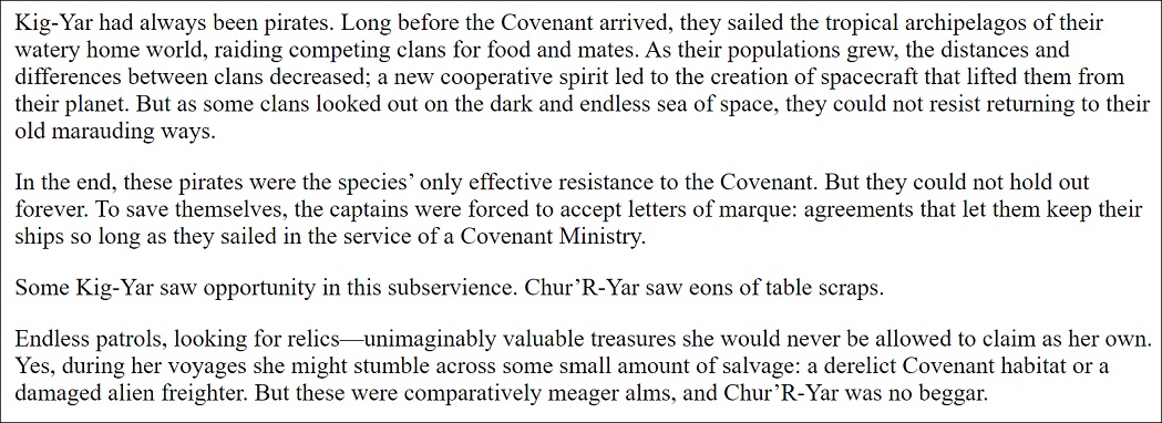 I have been extraordinarily critical of almost everything Halo related that hasn’t been the games, so for a while there I was worried that this entire retrospective would be far too negative. I doubt we’re done with the stuff that isn’t great about this series, but I’ve got to say that this book is a definite highlight for me. It’s not the best of the books as I still think First Strike has the better action and overall has fewer flaws than this one, but it finally tells a story that feels like its occupied by flawed humans we’re supposed to identify with rather than stock cardboard cutouts and super powered weirdos in power armor. It admittedly starts off a bit rocky as the books are still going all in on The Insurrectionists being the bad guys despite them being the side fighting for their independence (the prologue of the book involves Insurrectionist suicide bombers) but it does introduce us to a young Avery Johnson who is probably the third most recognizable face of the franchise and follows him on his journey to the planet Harvest where the first battle of the Covenant War took place. After some harsh missions that left him scarred and a personal tragedy that left him without an emotional fallback in his life, Johnson gets himself transported to the seemingly innocuous colony planet to train the locals as a militia who will hopefully fend off any Insurrectionists attacks. This is all just a ploy however by the Office of Naval Intelligence (the quote-unquote “GRAY” area of the UNSC that deals with spy stuff) who want someone with his decorated past to investigate a series of destroyed transporter ships that were supposed to bring crucial supplies to the planets, and when he and an old colleague spring a trap on a decoy ship they find themselves in First Contact with an alien race; a Covenant ship supposedly there for the purpose of spreading the word of the Covenant and looking for Forerunner artifacts, but were moonlighting as SPACE PIRATES!