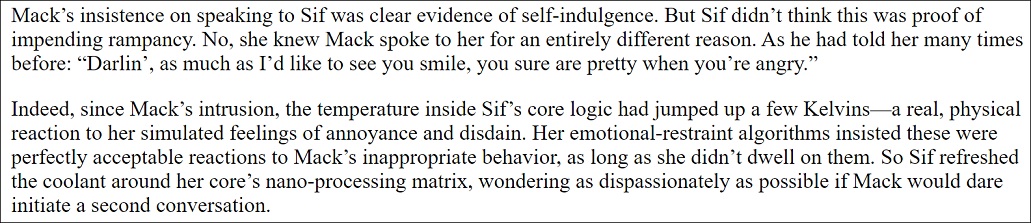 I mean it’s not BAD as this definitely serves the purpose of cementing the bond between Dadab and Lighter Than Some, but… you know… eating farts. It’s also not the only part of the book that overshares a tad as we have two AIs in here with a very 90s style sexual tension (the man keeps badgering the girl and we’re supposed to think it’s cute) where the descriptions get a bit silly to say the least.