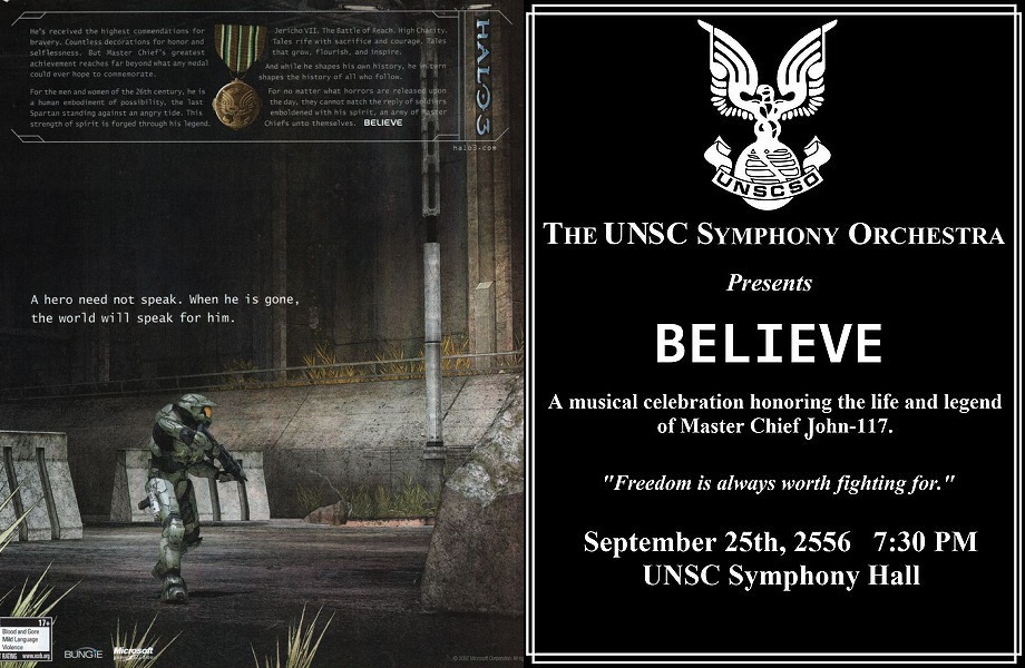 There are a few other pieces of media connected to the Believe campaign aside from the commercials. For a while, the diorama was viewable from multiple angles on Bungie’s website via a flash program, but sadly that is no longer available and all we have left are some of the screenshots. To lend further credence to the whole documentary feel, there were art galleries in the UK that displayed “war pictures” from the Covenant War and a separate commercial filmed at one of these locations. There was also an orchestral performance at the Project Revolution music festival playing a Master Chief memorial song and while I can’t find any footage of it, there were pamphlets handed out that we still have copies of. There was also a magazine ad that had similar verbiage to it and we also have copies of that still floating around.
