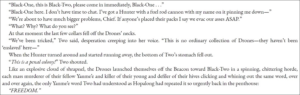 Well would you look at that! It’s the OTHER side of the problematic Halo coin! So along with the valorization of inhumanity we have the issue of vilifying the Other; not just creating an enemy with an ideological or complex reason for hating the Humans, but creatures that are more or less inherently evil and therefore justify the horrendous things Humanity does to itself to fight them. The more recent books like Contact Harvest and The Cole Protocol have actually done a pretty darn good job of giving more depth to the various races of The Covenant so it’s not something that pops up TOO often anymore, but boy do they go back for it in this story as a covert Spartan team is sent to destroy a giant Covenant structure collecting fuel from one of the many colony planets before glassing it. It’s actually a pretty solid premise and kinda brings to mind old Western Stories or even Laurence of Arabia where a guerrilla force has to put a dent in the machinery of its enemy, but sadly the writing is just not strong enough to get the most out of the premise. There’s simply no personality to the giant structure which is just called THE BEACON, and there’s nothing interesting going on with any of the Covenant running the operation. You don’t have an Elite supervising everything who wishes he was anywhere else, or a Jackal looking to make some cash on the side; it’s just kinda THERE just waiting to be attacked like a level in a video game. The only thing that gives this story any real sense of identity is also its biggest flaw which are the Yanme’e (the annoying flying bug dudes from the games) who are literally ENSLAVED to work on this Beacon and dig for the precious resources that it sucks up. The Spartans find one Yanme’e who has been MUTILATED and is begging to help them destroy this thing so he and his colony can be free which sounds like a great idea and gives some depth to the Covenant overall, but the story once again falls short of its potential. Really it’s the only thing of note about this story so we’re jumping straight to the end where the Spartans are halfway through their mission and it turns out the Yanme’e are actually all EVIL and just start killing everything because… I don’t know; it’s a twist I guess?