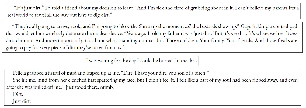 Okay, so while I wouldn’t call this a “lighthearted romp” or anything, it’s probably the best story we’ve had so far and is honestly one of the best things I’ve read in the entire Halo canon. It’s a story about an ODST solider who kind of end up being as big a part of the franchise as the Spartans as they are more or less the Colonial Marines from Aliens; tough as nails soldiers with a chip on their shoulder but usually end up as cannon fodder for the monster of the week. This time the monster is WAR ITSELF as the story follows Gage; a snot nosed angry young man who leaves his farm and his dad on Harvest to join the Colonial Army before eventually moving on to the ODST after an Insurrectionist terrorist attack nearly kills him and ACTUALLY kills a bunch of his friends. We follow his career as he’s training to be an ODST right as the Covenant destroy Harvest and end as these stories must; with him spilling his guts on the battlefield and telling a fresh faced new recruit his sad tale. The framing device is a LITTLE bit silly as this is a pretty lengthy short and the idea is that he’s telling this ENTIRE story to the kid while his insides are scrambling to his outsides, but it’s a story and some literally license is warranted. What’s a little LESS warranted though is the way it beats you over the head with its use of the word DIRT; just in case you forgot what the story was called.