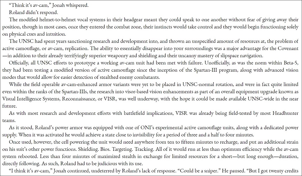 Now this on the other hand is much more in line with what I expect from the Halo books. Not necessarily a BAD version of it, but still has plenty of eye rolling moments and some iffy framing. We’re back to the good ol’ Spartan III program which I THOUGHT only had the one mission at the start of Ghost of Onyx before Spartan III Part 2 started up and were still in training, but apparently some of them did make it to the front lines as Headhunters; pairs of soldiers sent in for covert operations to take out entrenched targets. This story follows two of them, Roland and Jonah, who are on a mission to take out yet another Covenant base that’s there to dig out some sort of Forerunner artifact, and as you’d expect things don’t go as planned. The first that stuck out to me about the story is the odd decision to have these long diatribes and explanations about what are ultimately insignificant details about their armaments and tactics before resuming with whatever it was the characters were doing. I get the feeling that this is just another thing that separates me from a particular subset of the Halo fandom as I can see the appeal in this kind of minutia in a certain context, but for the story just stop in its tracks and halt all its momentum to explain how a helmet works or the most tactically advantageous way to knock a tree down, it’s hard for me to get invested in this story as it was going on.