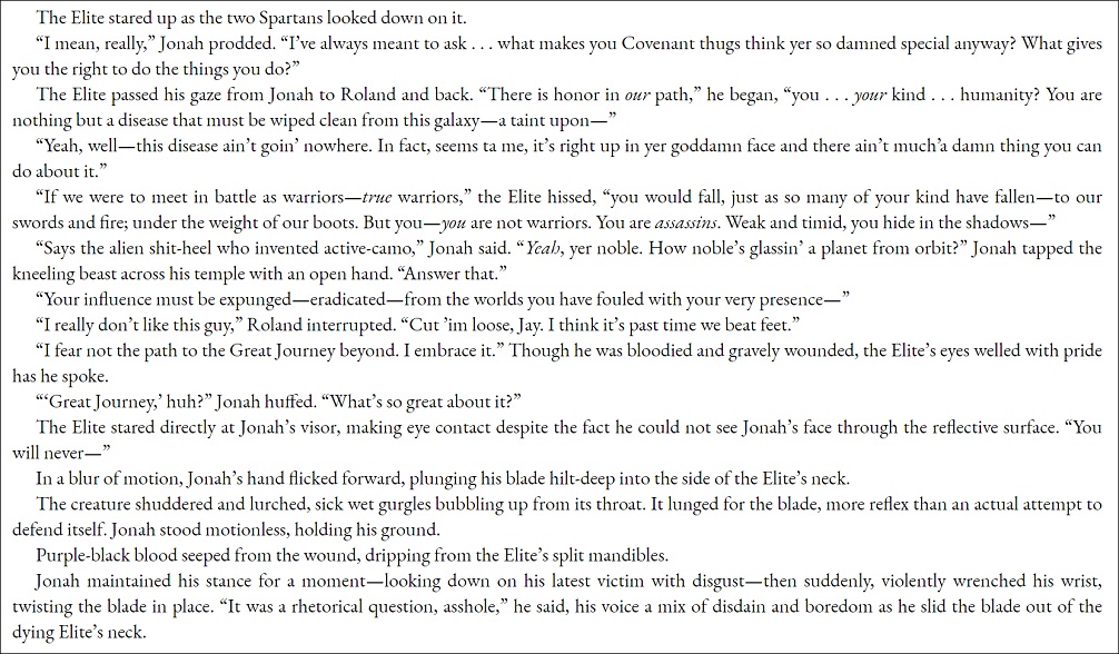 Again though, that attention to detail is probably something that will appeal to fans looking for something more focused on the tech and combat than the story and characters, and for what it’s worth it’s at least well written enough that it held my attention until the end and there ARE some bits and pieces within the story that I genuinely enjoyed. Very rarely do the humans and Covenant talk in any meaningful way other than shouting one liners at each other and there’s this pretty intense moment where they have a captured Elite and more or less taunt him with questions which not only creates an interesting clash of ideas but reveals the deep pain behind the words being spoken in a way that was pretty disturbing yet incredibly captivating.
