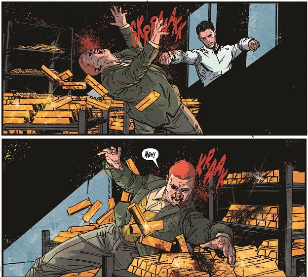 As it turns out however, this is going to be the highlight of his day as Bond, John, and Aria have taken a phone from one of the many ORU agents they disposed of at the end of the last episode, and is giving everyone in the organization an ultimatum; walk away or get killed. Some take their advice and try to run away, but they don’t call Goldfinger a Supervillain for nothing and he swiftly eliminates the defectors with FREAKING MISSILES that he just so happens to have on hand whenever he needs to instill a little fear and discipline. With the ORU agents brought back in line, it’s time for his master plan at Olymptech Paradise whatever that may be, but they seem to have figured out that a few ORU agents are meeting with the head of security on the island, so they kill those three and assume their identities to find out what’s REALLY going on. This is where things take a turn and I’m honestly not sure that I like it. I’ll give them credit that it does create a degree of ambiguity here as the seedy underbelly of Olymptech Paradise is exposed and this creates some friction between our heroes and Goldfinger who’s interest may be a lot more aligned than first thought. The problem is that there are MANY ways they could have done this… but in a book that is otherwise pretty light and uses grim story beats sparingly, the revelation here sits pretty heavily on the rest of the book. See, the security director isn’t working with ORU to try and destroy the island or for some sort of bribe; he was convinced that they would help him bring JUSTICE to this place because it’s Libertarian ideals have been used to cover up HUMAN TRAFFIKING AND MASS GRAVES!