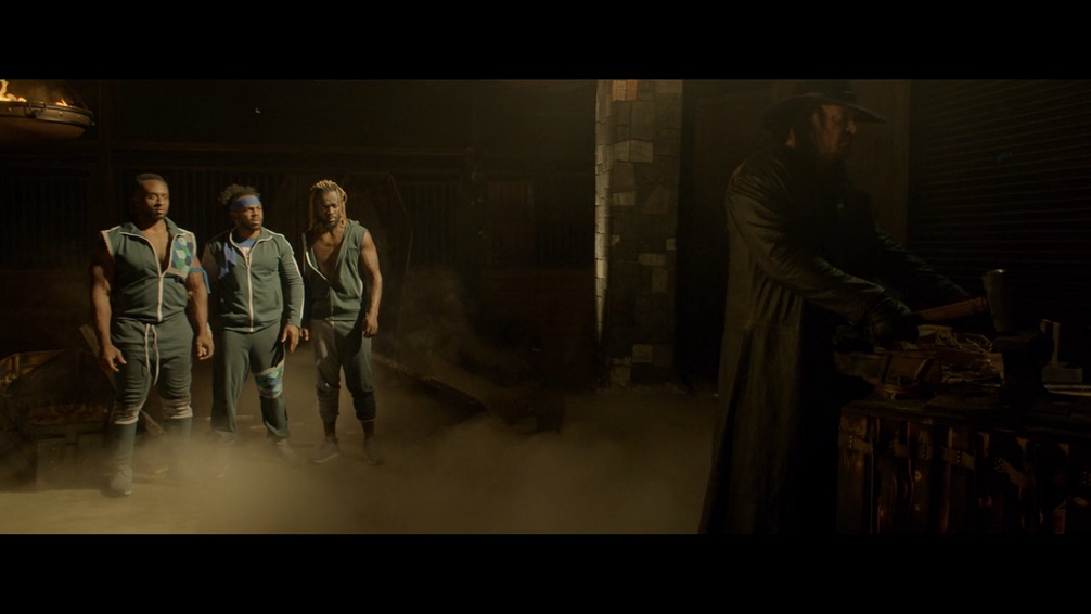 So it has all the trappings you want from something like this, both in terms of wrestling fan service and a haunted house experience, but how are the performances and the story? After all, wrestlers aren’t exactly known for their acting chops aside from Dwayne Johnson, John Cena, The Miz of course, and… I don’t know, Roddy Piper I guess? It does help that the script here doesn’t ask for much from anyone other than to do their usual shtick with the New Day being all chipper and goofy while The Undertaker stays menacing and aloof. He DOES come off less like a Machiavellian ghoul of pure terror than he does a REALLY stern dad that’s super disappointed in his kids, but for this kind of thing, it works. There’s not much of a mystery here for them to solve or even much danger to thwart which is a bit of a bummer, but I can see why they wouldn’t want to make it too complicated since it’s intended for families, and the New Day do get to stretch their acting chops a bit through their interpersonal interactions rather than through the machinations of the plot. It’s not much, but there are points where they strain under the stress of the situation and almost lash out at each other which is just enough for the big FACE YOUR FEARS moment to make sense. Since it’s wrestlers we should also talk about what kind of action scenes are in here, which should be a quick discussion since there are hardly any. I think the most dangerous thing someone does is surf on a utility cart, and the finale is not unlike one of those Cinematic Matches that were all the rage last year, though leaning more towards MOVIE FIGHTING than using creative camera techniques to shoot a wrestling match. It’s definitely a movie that is held afloat by the personalities in play and less by its story or set pieces as the New Day are always a delight to watch and The Undertaker can still lend some serious gravity to this character even in something as goofy as this.