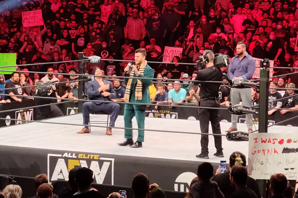MJF comes out with Wardlow and Shawn Spears to gloat about his win at Full Gear and to call out Hangman Adam Page, but he’s soon interrupted by CM Punk who ARGUABLY gets the biggest pop of the night; if not, it was neck and neck with Hangman. Just being there definitely heightens your emotions on these moments as I probably wouldn’t have marked out as hard seeing Punk come out on TV as I did when his music hit at the stadium. Everyone went wild and didn’t STOP going wild until Punk got in the ring and stared down MJF. Trying to keep it cool, MJF formally introduces himself and holds out his hand for a handshake… and Punk just blows him off before going to the back. Some more behind-the-scenes notes, Punk actually came out after the Rampage taping to talk to the audience a bit because he felt bad that all he did on Dynamite was walk in and walk out. I mean the crowd still popped for it, but it was still a very cool gesture from the guy!