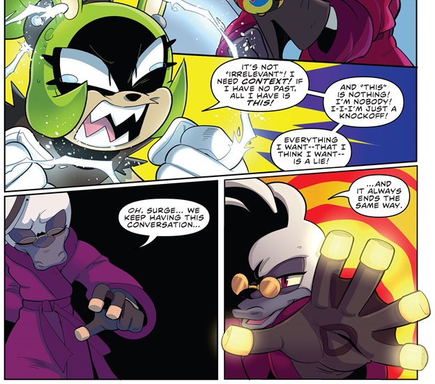 Right off the bat, this issue gets dark as we watch a series of video diaries from Dr. Starline where we hear his unfiltered thoughts and see the depths of his cruelty. His rage at Eggman is uncomfortably apparent at the start only to be tamped down by his insistence on self-control which is probably good for his blood pressure but not so much for Kitsunami and Surge who are in fact watching these videos along with us. Whatever these two may have done or the toxicity of their relationship, you can’t help but feel for them as they watch the one person they know in this world calmly talk about them as pawns in a game they are forced to participate in.
